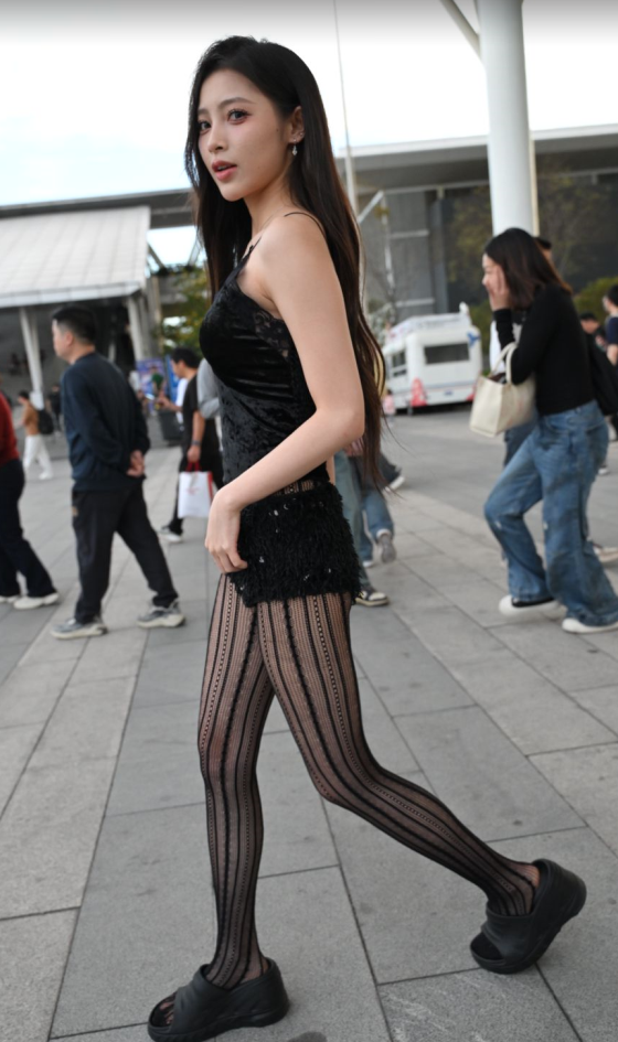 流苏短裙与铆钉鞋的碰撞,侧腰镂空与竖条纹S袜的交织。路人模糊成流动背景,唯有她如黑曜石般切割夜色。这不只是街拍,是一场用身体书写的行为艺术。