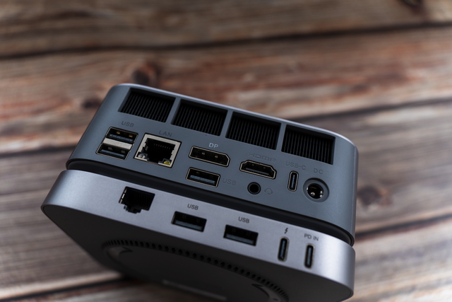 对于大部分迷你主机而言,得益于相比笔记本更宽松的厚度限制,机身搭载的接口一般都非常丰富。比如我一直在使用的零刻 SER9Pro,DP、HDMI、USB4(Type-C)/ USB Type-C/ USB Type-A、LAN(2.5G)一应俱全,机身内置的双 M.2 盘位也能够满足大部分用户需求。