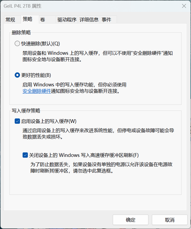 需要注意的是,在部分 Win11 系统中,默认外接存储的读写模式可能是快速删除+不启用写入缓存,此时写入速度会受到比较大的限制。如果想要获得满血的写入性能,需要在属性-策略内,开启更好的性能+启用设备上的写入缓存。