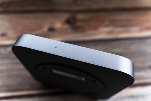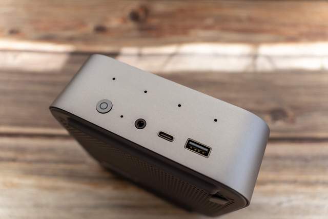 SD4.0接口放置在了侧面,正面则仅有电源指示灯,这样的接口摆放更多考虑的是美观。从实用角度出发,个人觉得更合理的布局是 LAN 口、USB4 v2/雷电、USB PD 电源输入放置在后侧,而 SD 与两个 USB Type-A 移到正面,并增加一个 TF(MicroSD) 卡插槽。