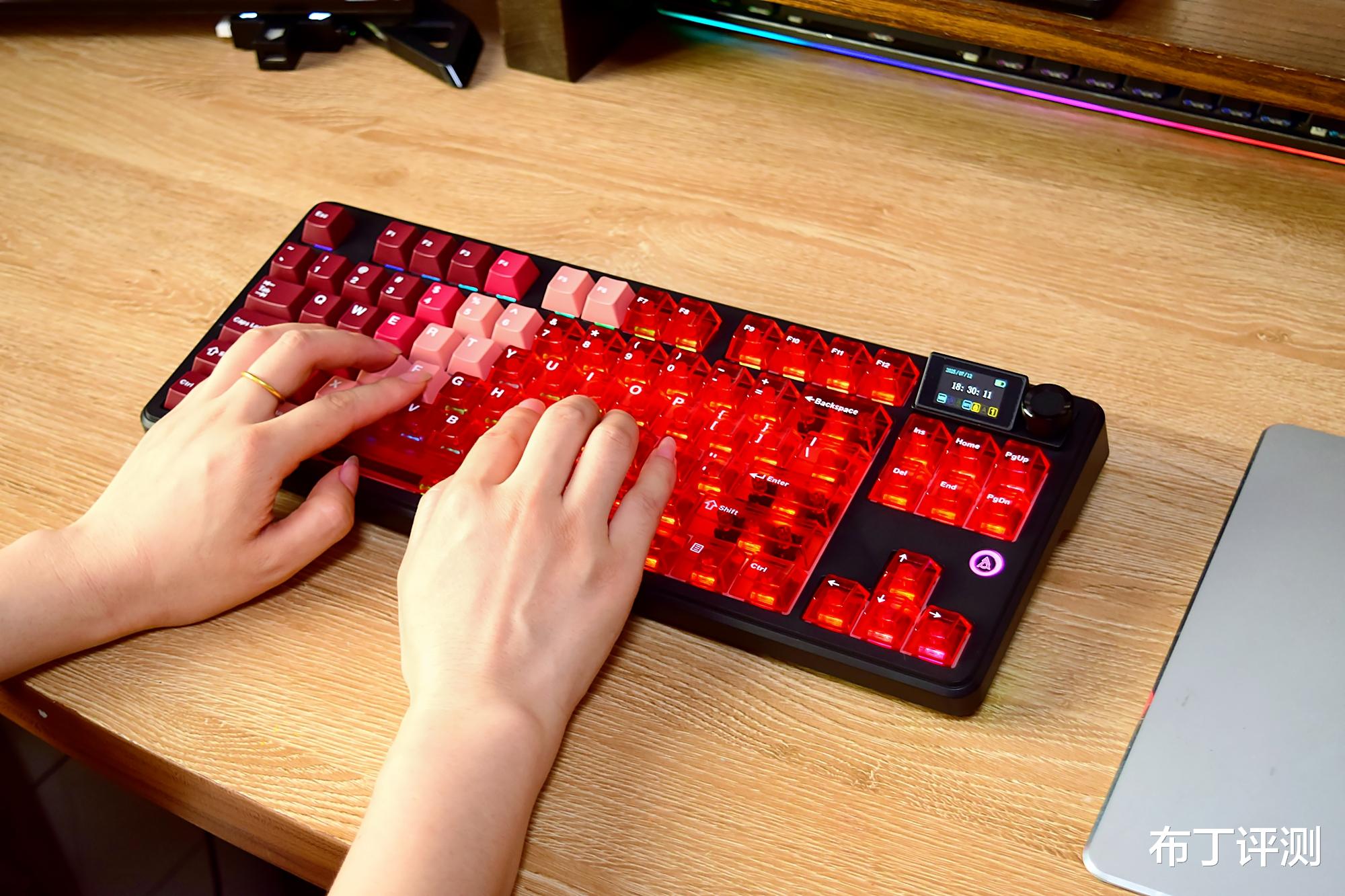 我选择的是赤焰红版本,采用了4种不同配色,从左到右逐渐由深红、橘色、粉色到透明红渐变,再搭配侧翼灯带和TFT彩屏,让整体看起来更加个性时尚,简直就是桌搭党的必备好物。