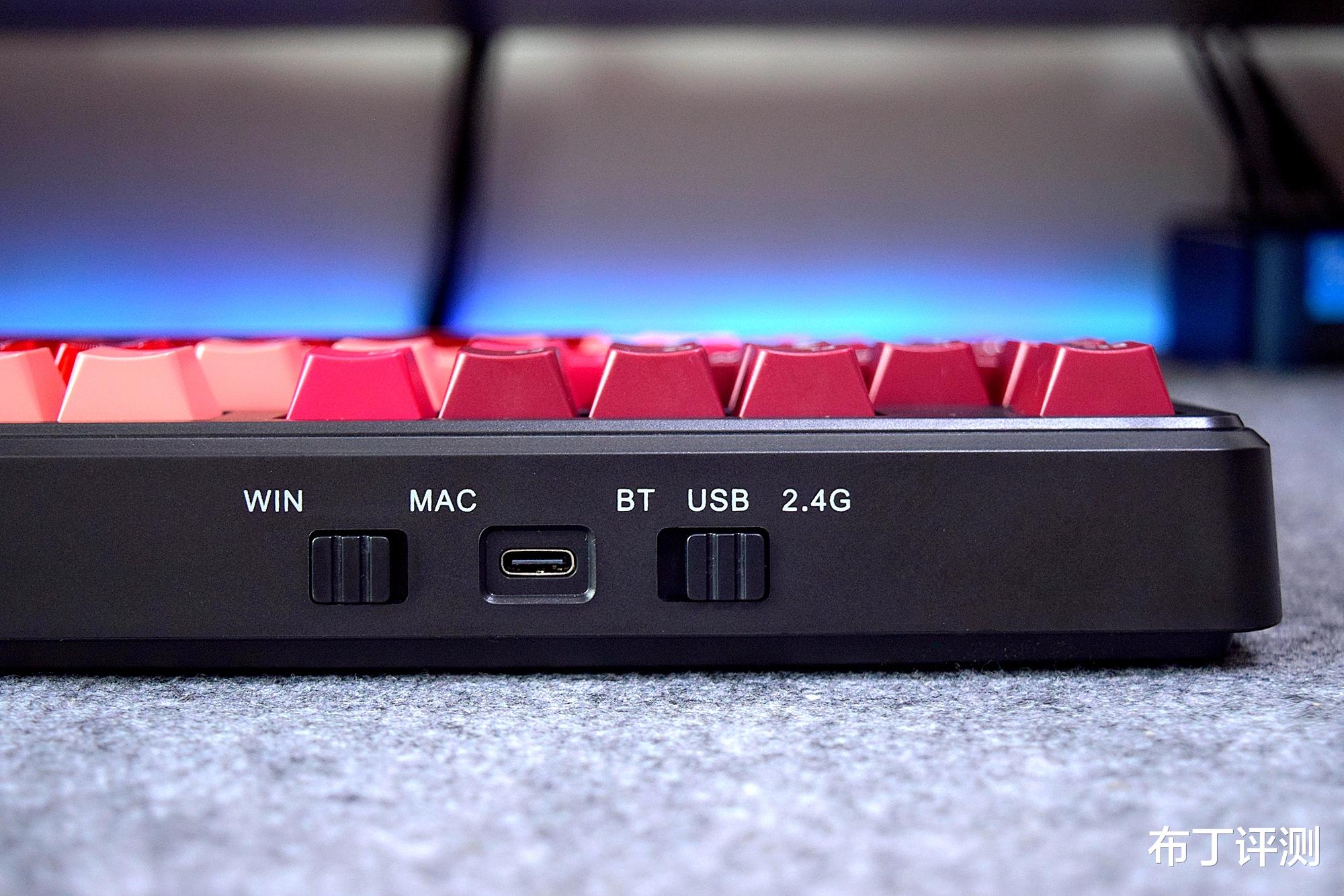 键盘的接口和按键被集中放在了机身背面左侧位置,从左到右依次MAC/WIN切换键、Type-C接口和模式切换键,支持多系统和三种连接模式,而且支持三台蓝牙设备快速切换,轻松满足不同场景的使用需求。