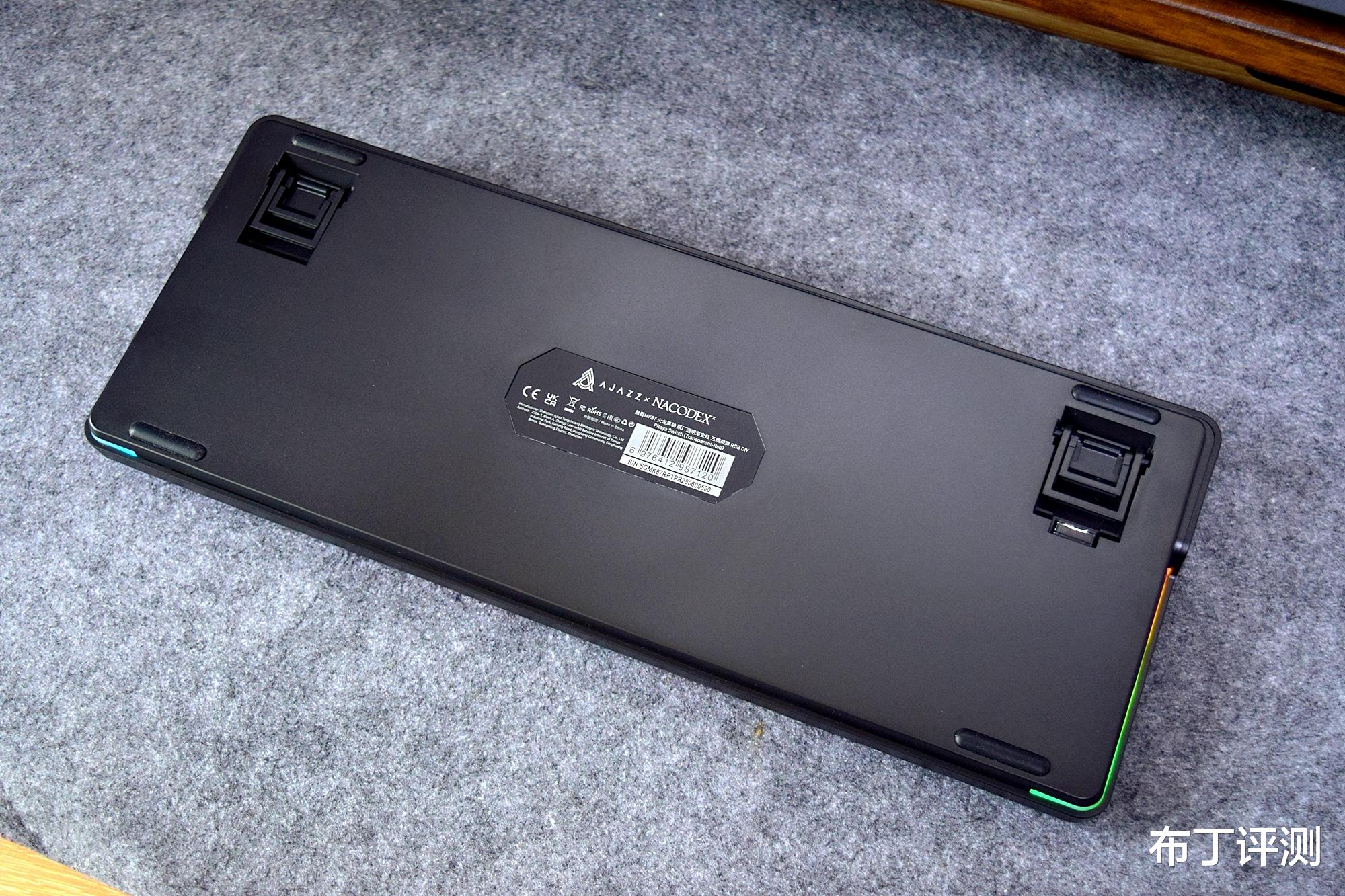 黑爵MK87的底部十分简约,在靠近边缘的位置有4个条形防滑垫,能让键盘放置更牢固。另外在靠近上方的两侧还加入了可折叠脚撑,其中右侧脚撑处有个隐藏设计的2.4G接收器仓。