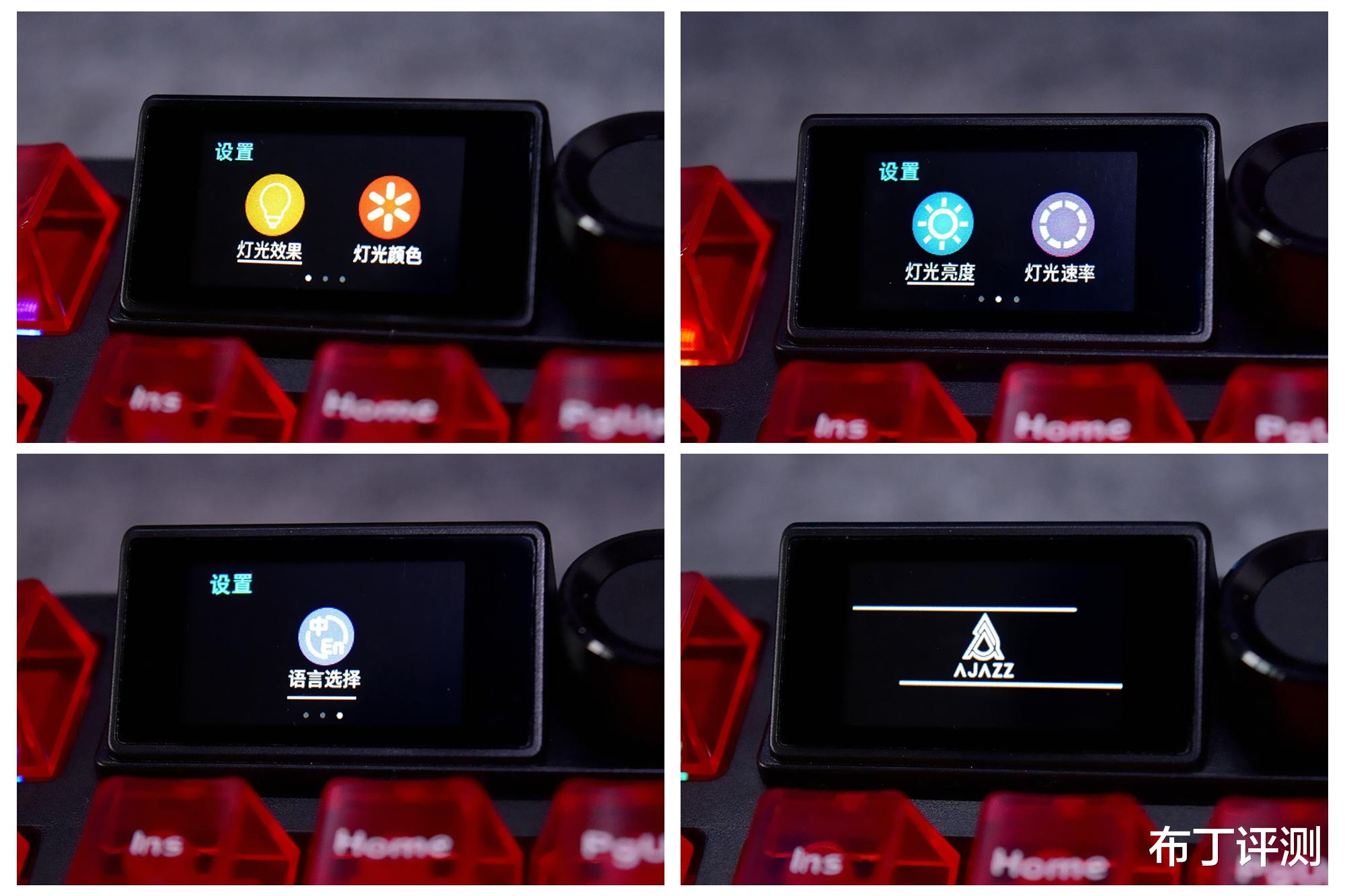 键盘的屏幕功能丰富,不仅可以显示各种信息,通过长按旋钮键还能进入到设置界面,可以进行灯光效果、灯光颜色、灯光亮度、灯光速率、语言选择等操作,无需通过驱动也能快速对键盘进行各种设置操作。