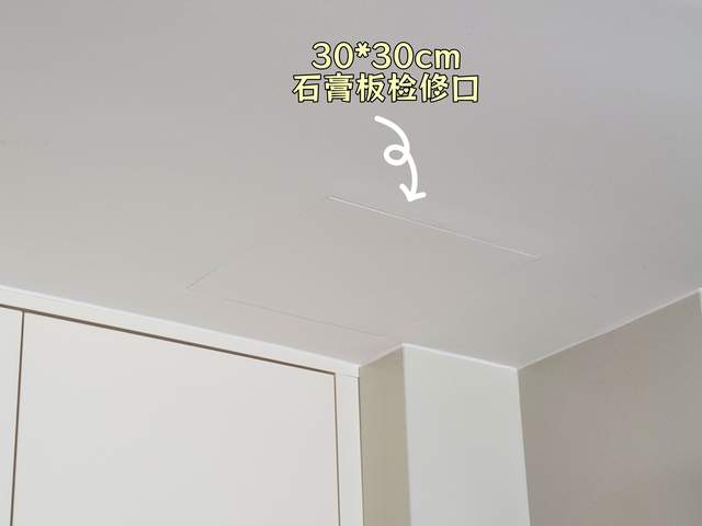其次,还需要注意的是厨房区域记得要预留一个检修口,一旦吊顶内的设备出现问题需要检修,如果没有预留检修口,就需要破坏大面积的吊顶,这不仅维修成本极高(拆装工费+重新刷油漆费用),而且会产生大量灰尘,严重影响整个客厅和餐厅的日常生活和美观。我家预留的是30*30cm的石膏板检修口,与吊顶融为一体,不放大细看,不太容易发现。