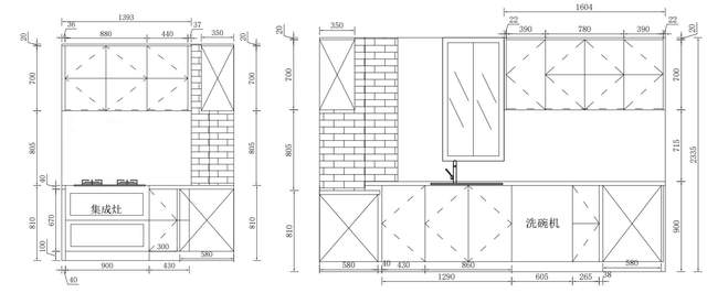 4、厨房吊柜、橱柜的设计思路厨房吊柜主要是两组,一组在集成灶的正上方,用来放置不常用的厨房物品;另外一组则在洗碗机的上方一直延伸到冰箱柜,两组吊柜的深度是35cm,高度是70cm,无门把手设计,门板下沿1cm,因为整个装修风格是原木奶油风,所以地柜选的原木色,吊柜选的是奶白色。