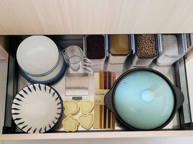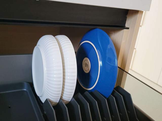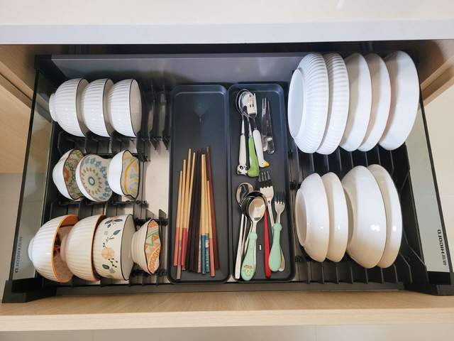 提到这里,我想顺便再说一下拉篮,在安装拉篮前,我也和很多小伙伴一样,觉得它可以帮我把盘子、碗筷、勺子啥的都归置得明明白白的,但是实际安装完成后,我才发现,碗篮是很挑餐具的,像稍微大一点,或者深一点的盘子,高度不够就很容易卡住。