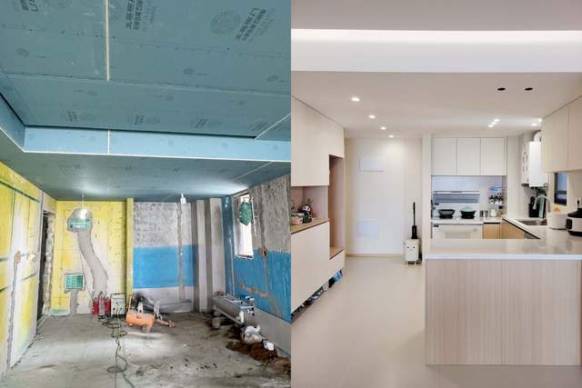 不得不说,装修的时候事情真的是又多又杂,就会很容易遗漏一些问题,在厨房吊顶阶段特别需注意的是,如果你家也要做开放式厨房,厨房上方的石膏板尽量选用防火/耐水的石膏板,更抗油、抗污、防水一些。