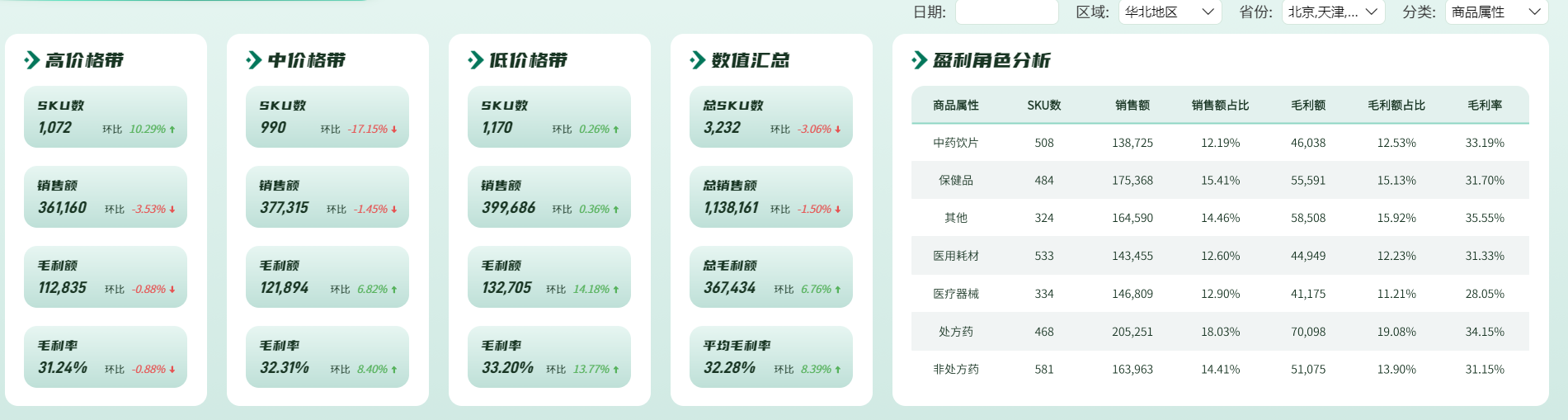 盈利结构失衡。低价带商品销售额最高,但毛利率环比下滑幅度最大,说明当前销售增长可能过于依赖降价促销,结果侵蚀了整体利润;而高毛利商品尽管利润贡献突出,但销售额占比有限,说明结构有待优化。