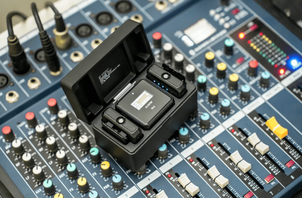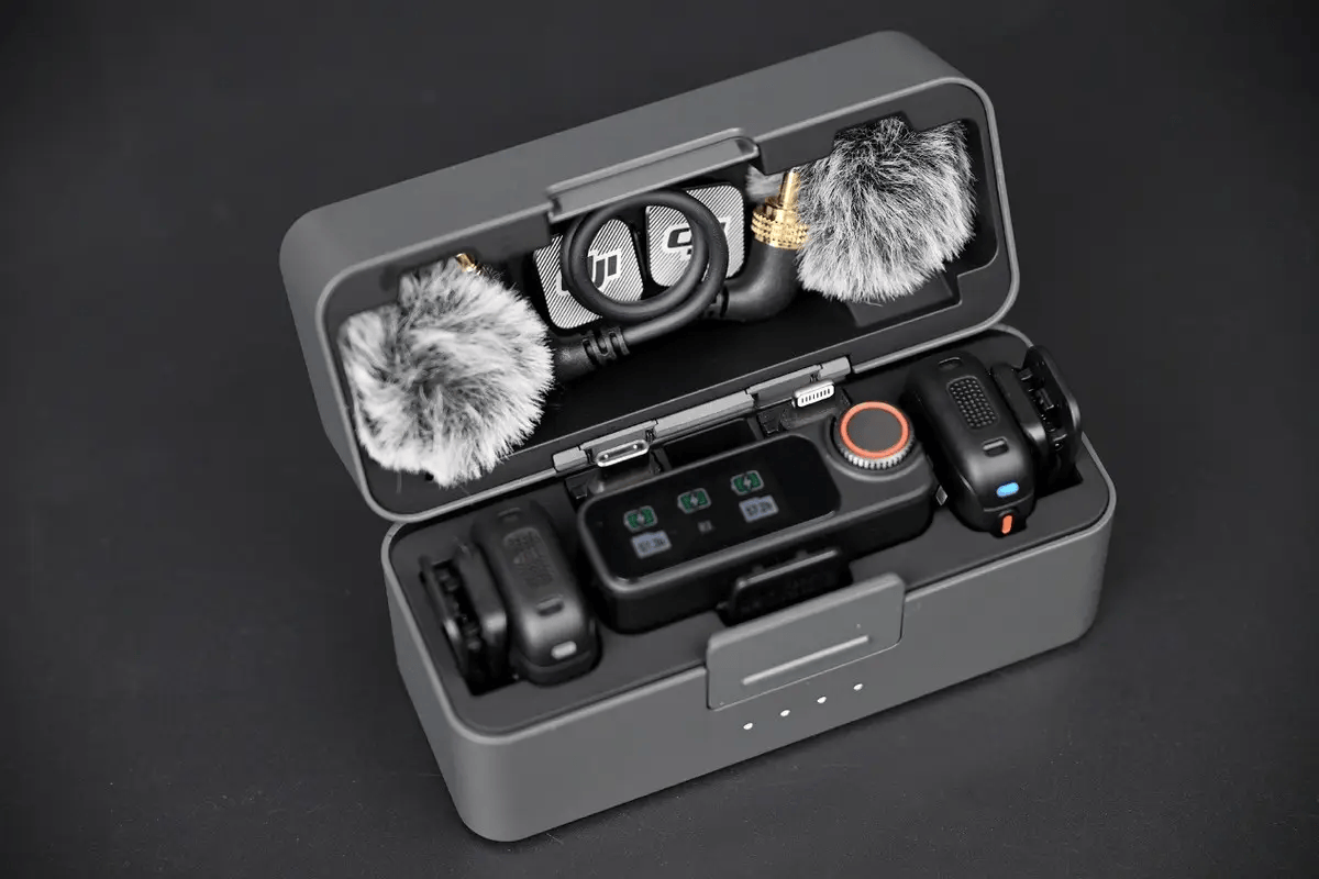 以“多场景协同+细节加强”为核心亮点,16克轻量化机身搭配磁吸+夹持双佩戴方式,360°旋转背夹可适配衣物、乐器等多种收音载体,按压解锁的充电盒内置磁吸卡槽,收纳时自动对位充电,随取随用更高效。音频性能上支持48kHz/24bit采样传输,新增高精度时间码功能,24小时内偏差小于1帧,多机位素材后期可一键对齐。创新四发八收模式搭配四声道独立输出,多人访谈、综艺拍摄时能单独编辑每路音源,32GB内置存储的32-bit浮点双内录,同时保存原始与优化音频,彻底杜绝素材丢失。双频段(2.4GHz+5GHz)自动跳频传输,复杂电磁环境抗干扰能力比较突出,三挡音色预设(常规/饱满/明亮)与两挡降噪可精准适配不同场景。