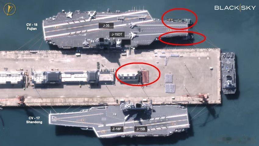 从10月25日这张卫星照片可见,福建舰和山东舰同框停泊,飞行甲板停放了歼-15T、歼-15DT、歼-35战斗机,以及空警-600预警机,此外还有两架直升机,从造型看好像是直-9、直-20。可以说福建舰配套主力舰载机都齐了,这次肯定不是全尺寸模型而是真飞机,出海归来停泊状态同时摆这么多,基本就是最后准备。此外舰艏部分还有两艘小船在作业,这个时间点在港内用不上拖船,因此疑似进行涂刷舷号作业。