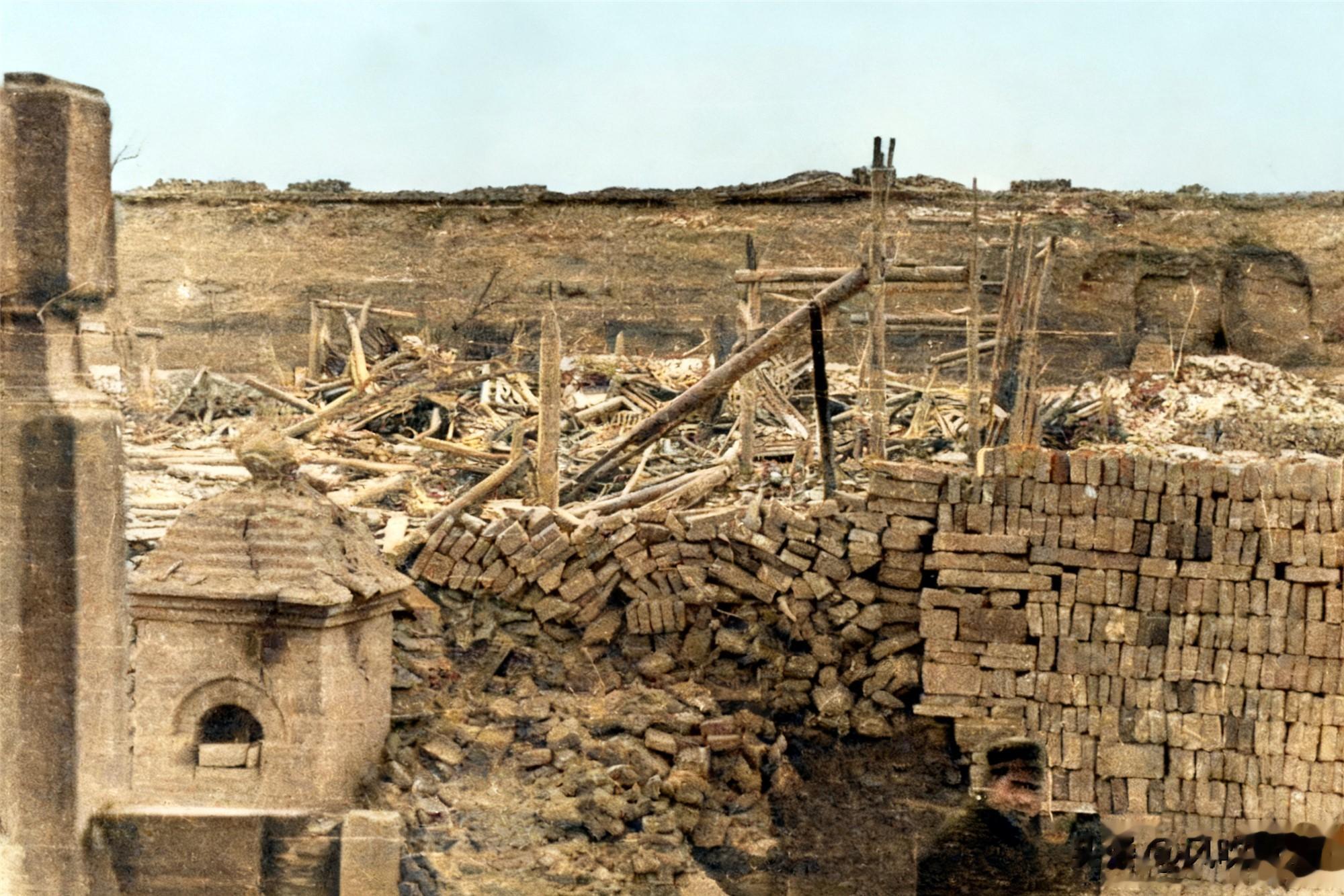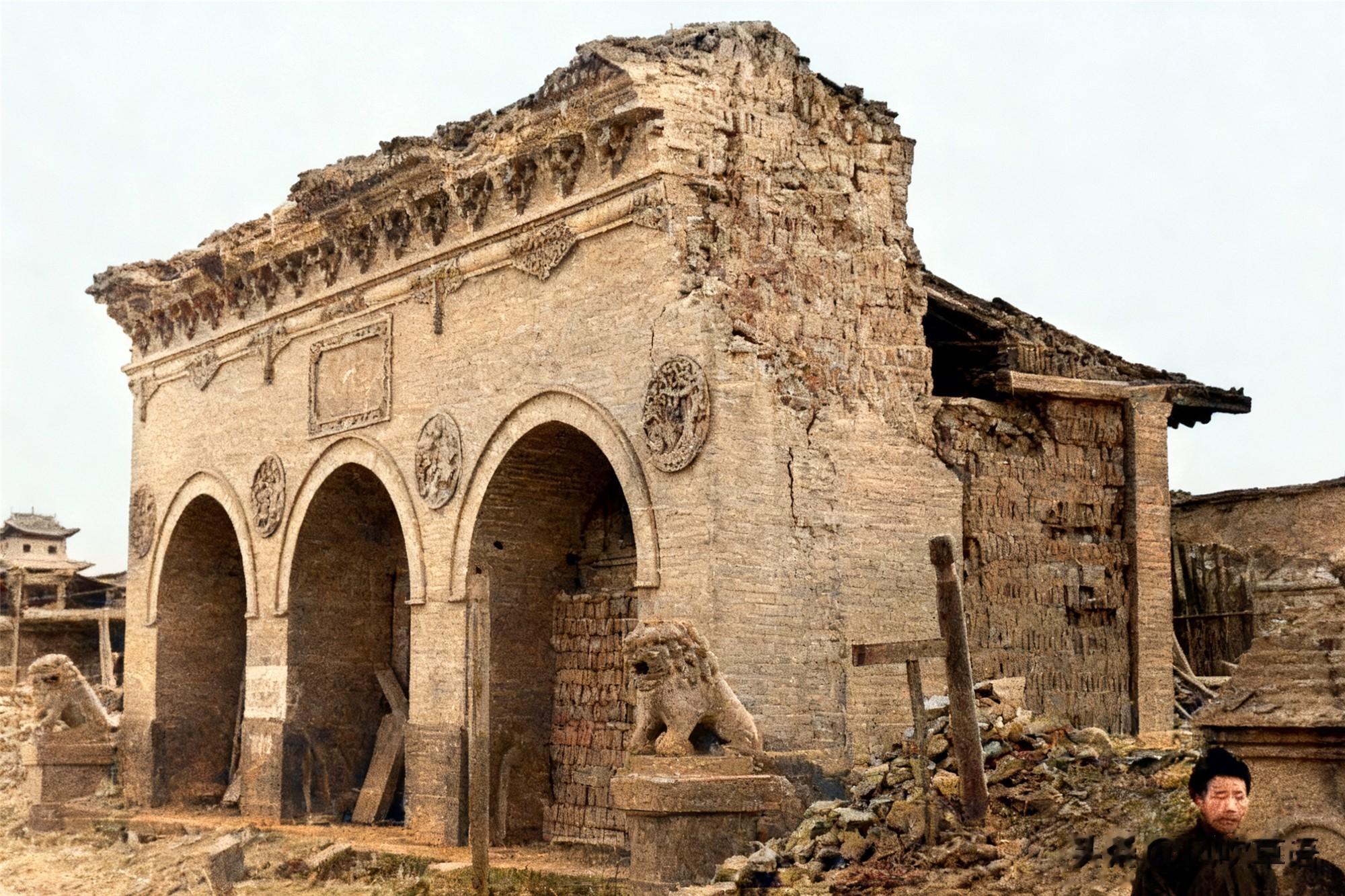 这张照片可以使我们更加清晰看到古建筑的全貌,建筑的破损和周围的断砖碎瓦并非因年久失修导致,而是因为日军飞机的轰炸。