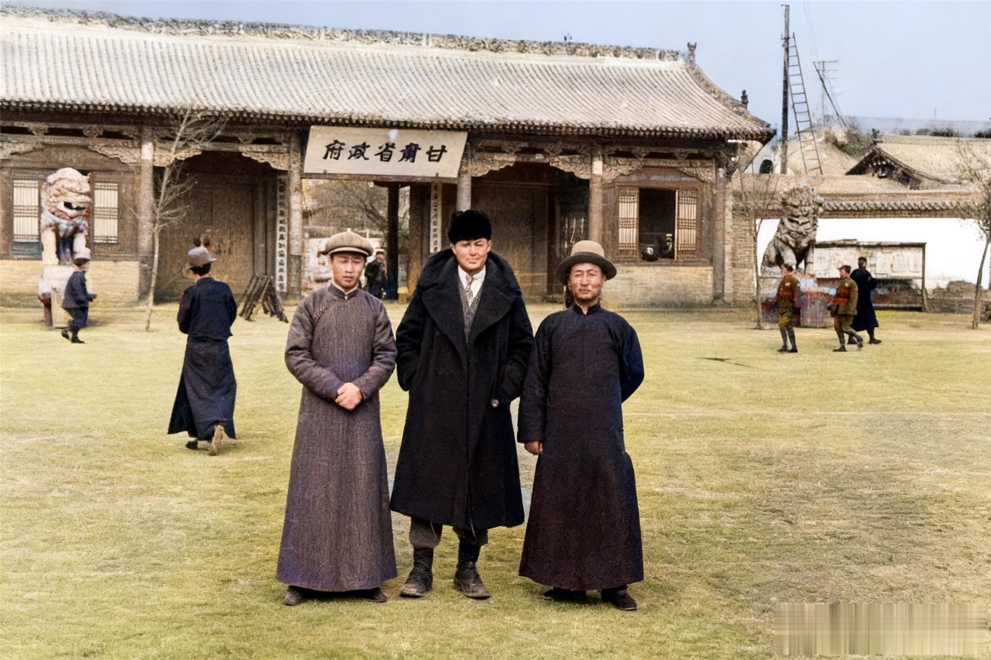 巴尔和两名中国男子站在甘肃省政府门前合影。省政府位于今兰州城关区,其前身是明代的肃王府,清代时为陕甘总督署所在地。