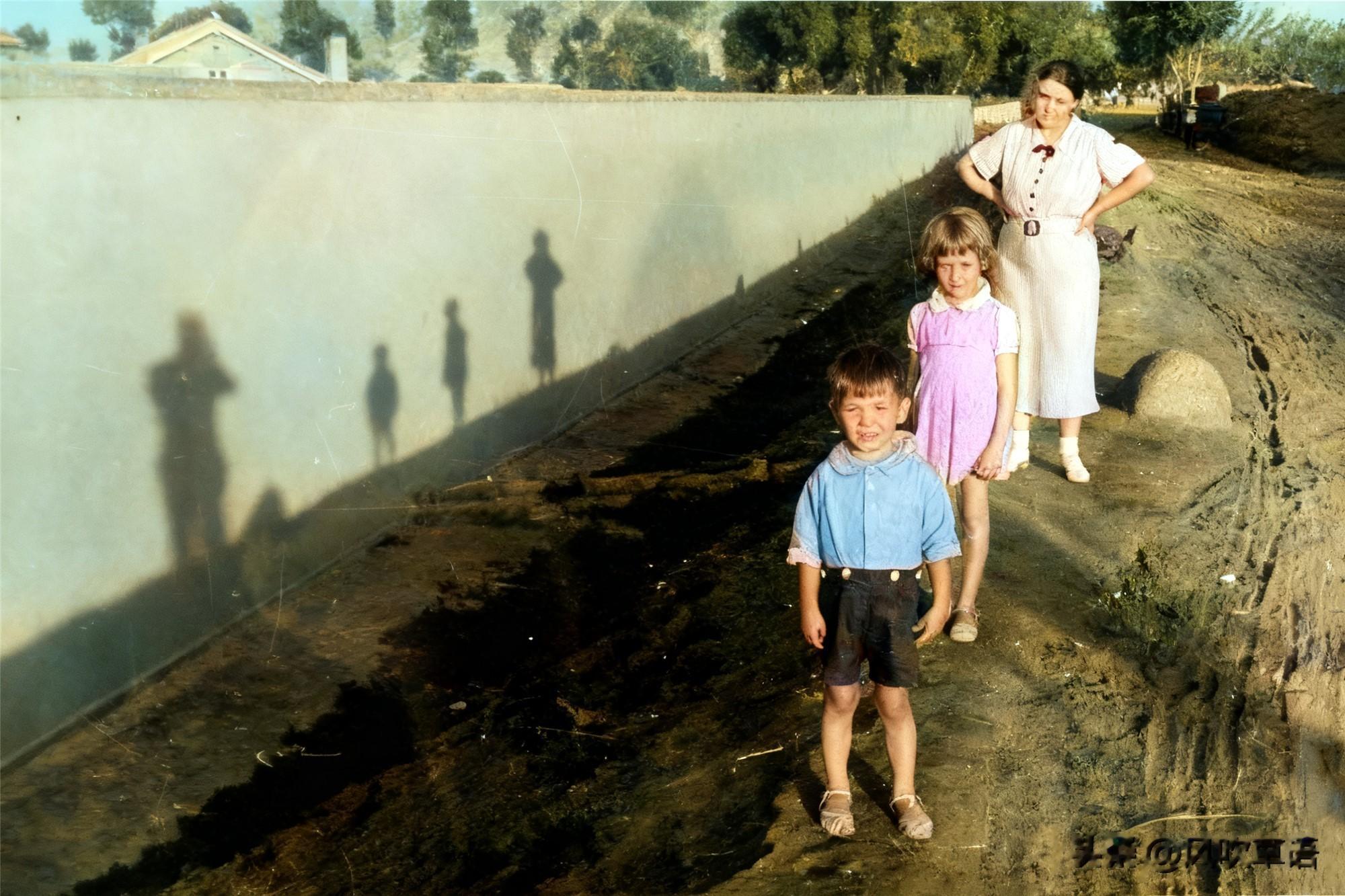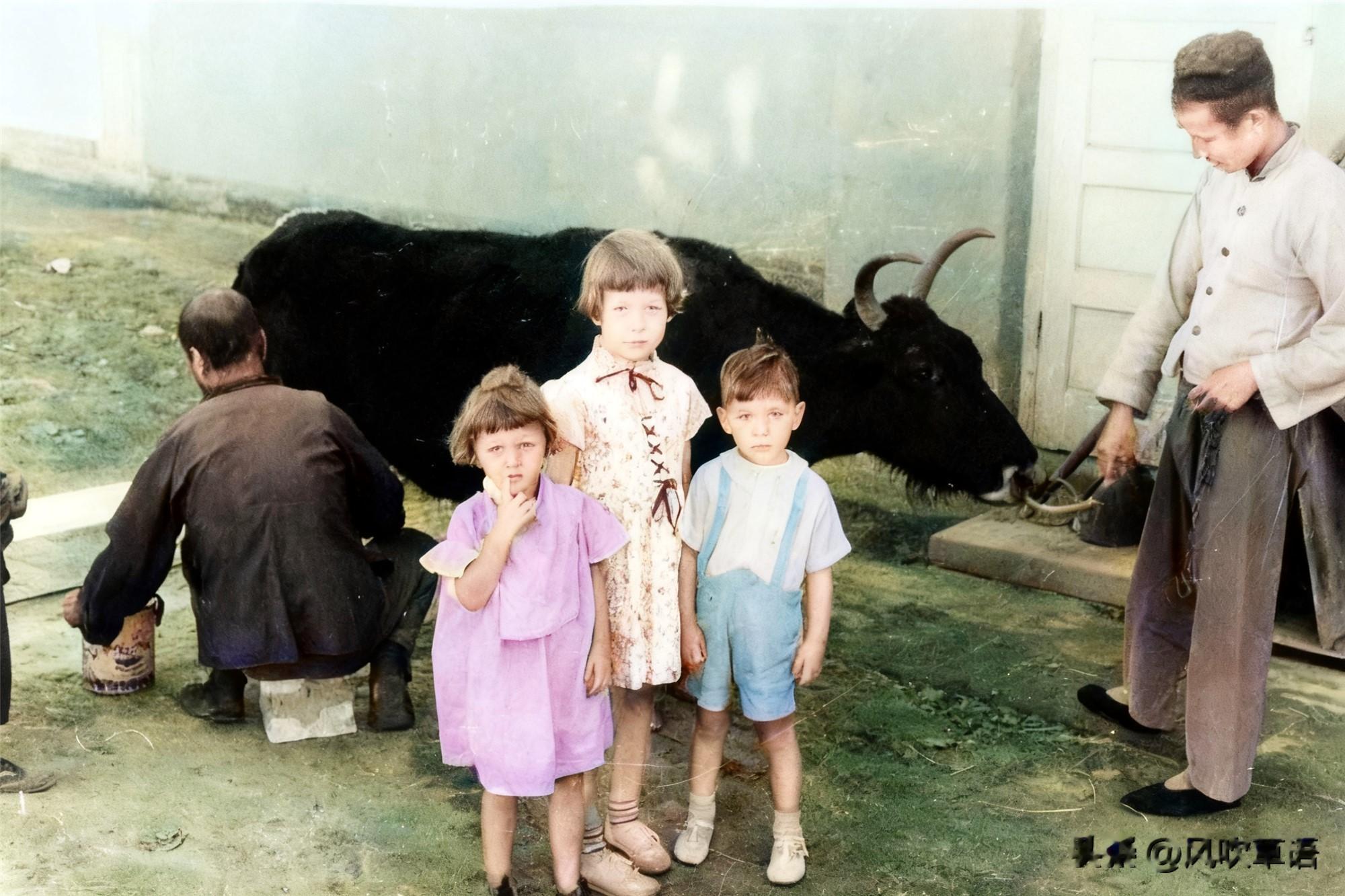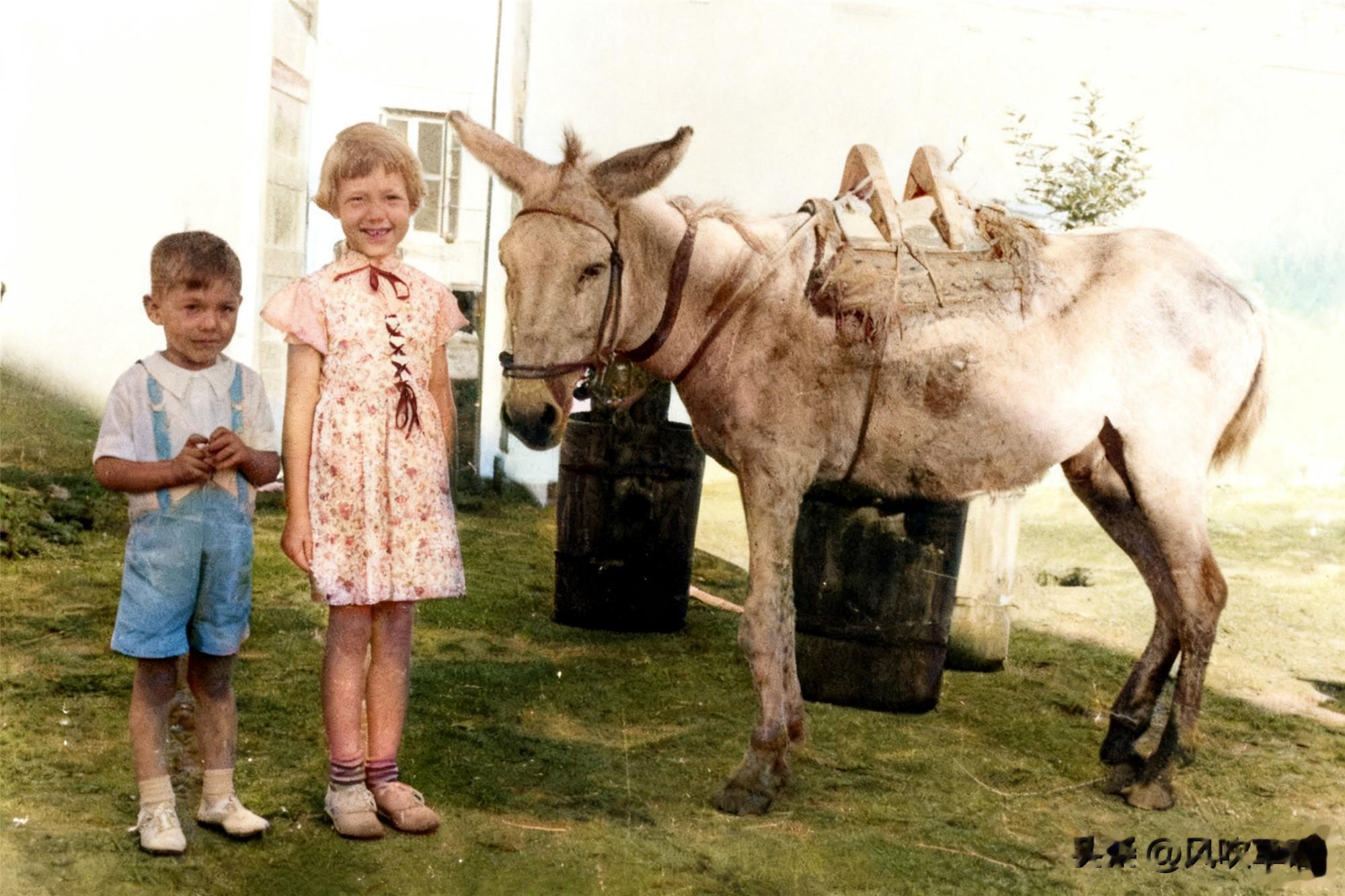 小姐弟站在一头毛驴的旁边,毛驴后部上绑着支架,地上放着两只水桶。这是一头专门从黄河中运水的牲口,负责给这个西方家庭供应每日的用水。