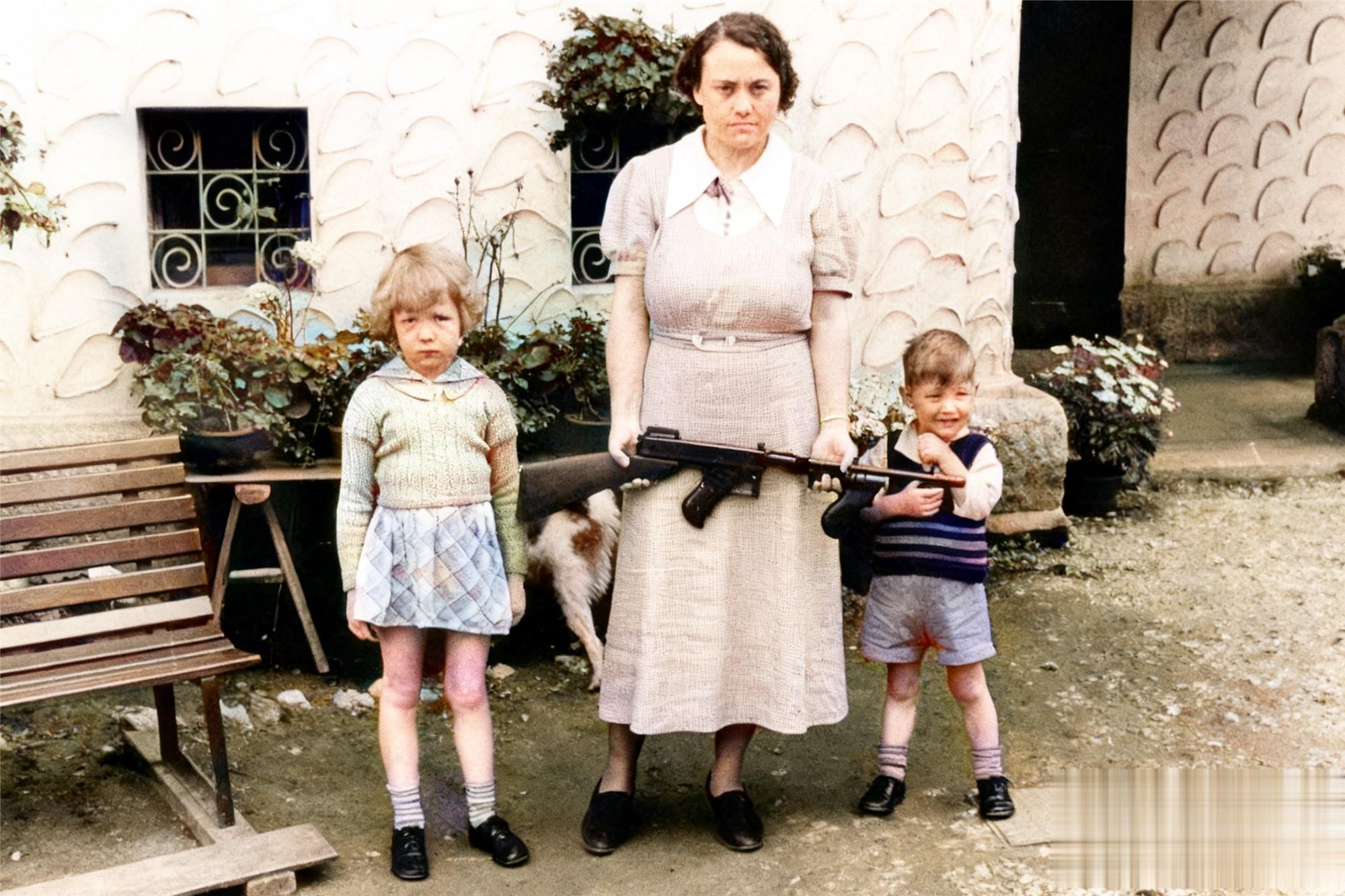 比起上一张叉着腰相比,这张照片中的妻子更加“彪悍”,因为手里拿着一把汤普森冲锋枪。图中介绍,他们从西安和兰州的路上一直带着这把枪用来防身。