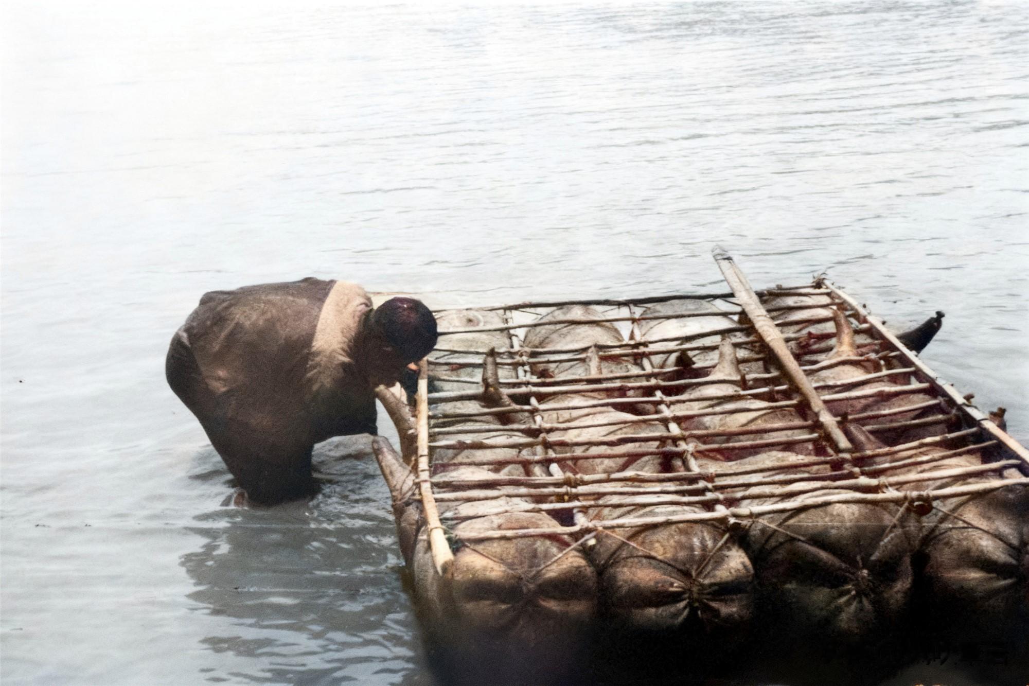 黄河岸边,一名男子站在水中正在给漏气的皮筏充气,那时候没有气筒,完全依靠嘴巴吹气,单就这一点来说,就很了不起。