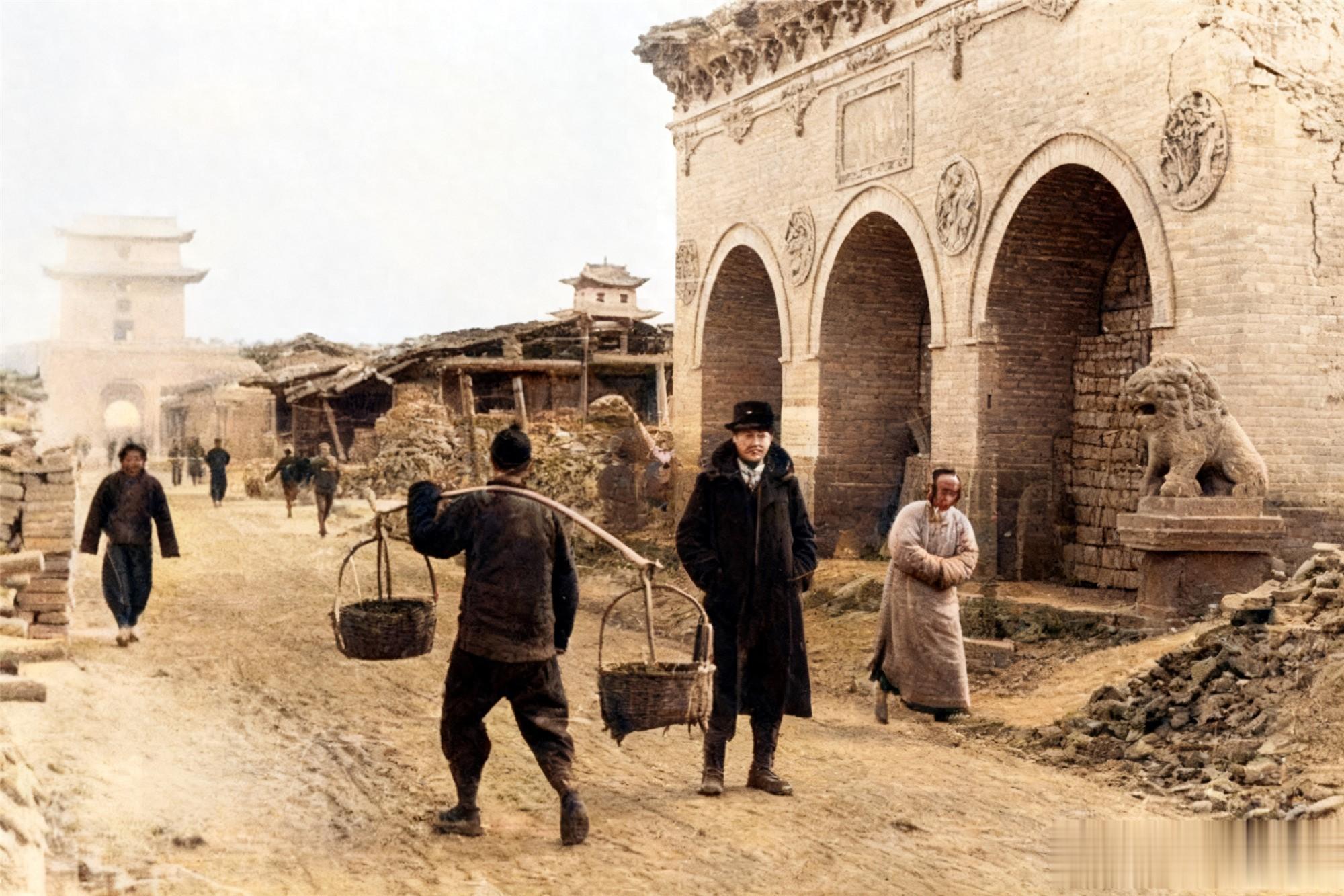 兰州城外一座三拱门建筑,拱门上有精美的石刻和石匾,可惜看不清上面的字,拱门两边有两座石狮子。不远处是兰州高大的兰州城门。