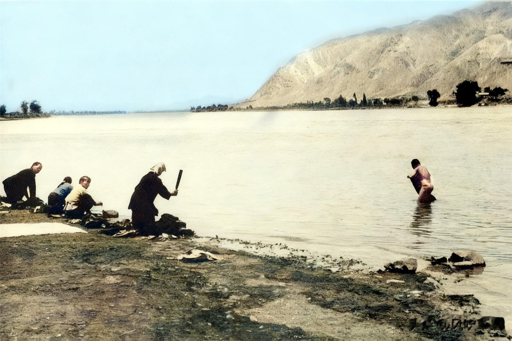 拿着棒槌,在黄河边上洗衣服的女人们,其中有中年妇女,也有大姑娘。因为裹着小脚,多数女子采用跪着的姿势洗衣服,这样反倒比蹲着更轻松一些。