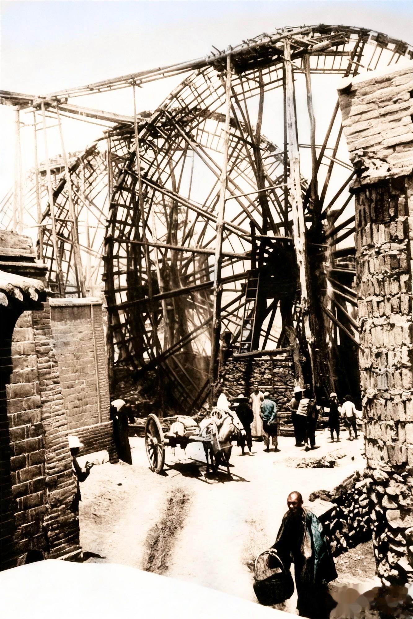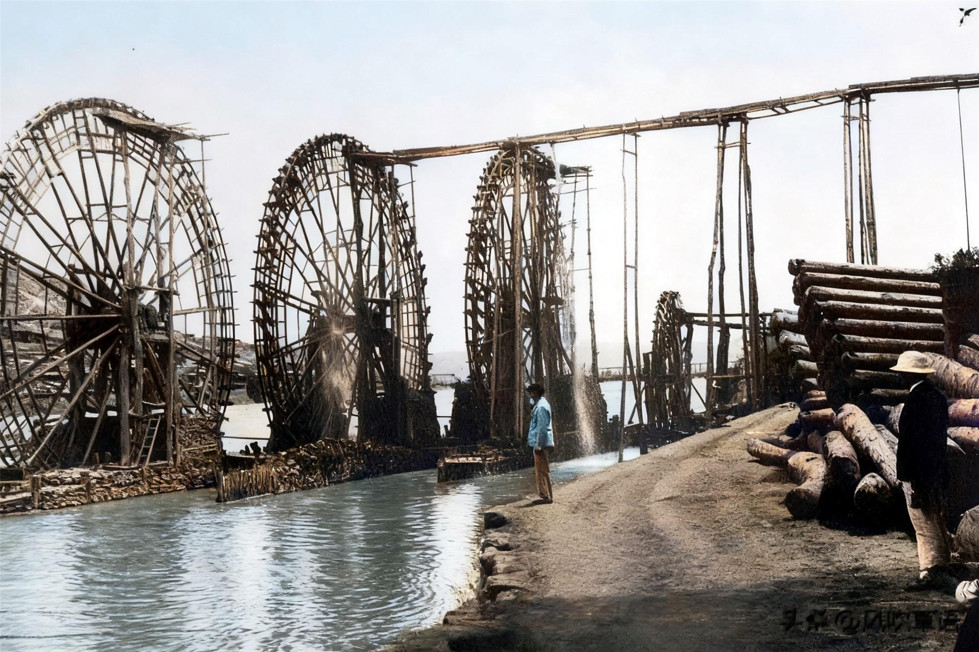 当年在兰州城外的黄河岸边,可谓是水车林立。兰州地处西北,降水量少,这些水车担负着为城市供水以及灌溉农田的作用。黄河水通过水车上面的管道,源源不断地输送到岸上。
