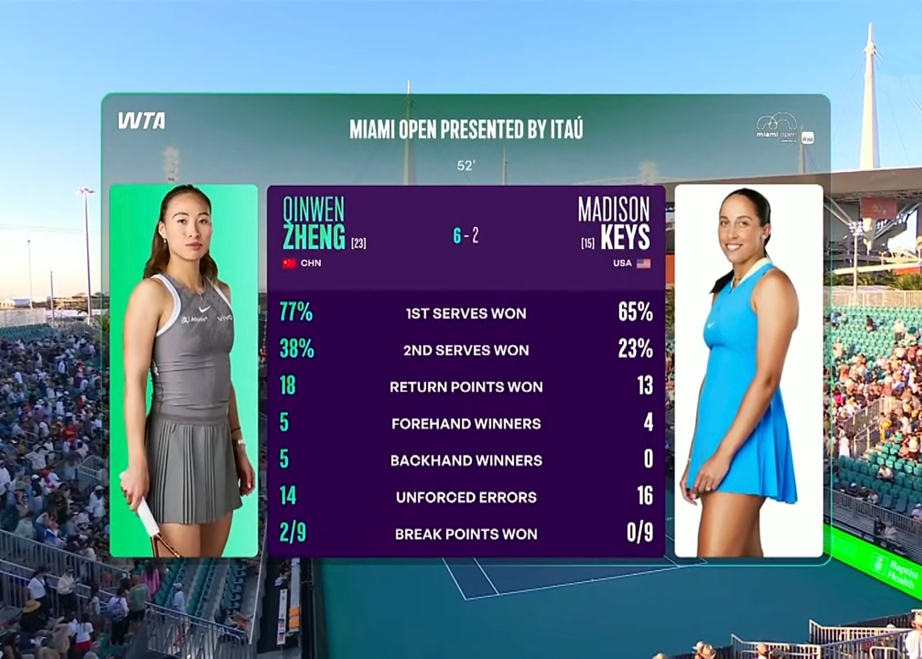 北京时间2026年3月23日早上,WTA1000迈阿密站第三轮,中国金花郑钦文对阵美国名将凯斯。