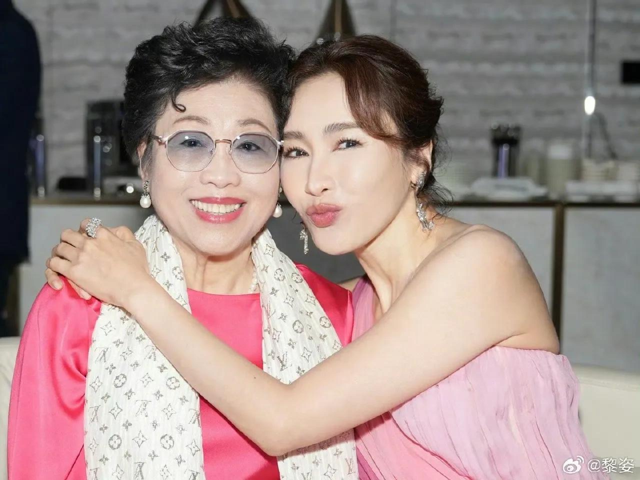 黎姿搂着妈妈,对镜嘟嘴撒娇,很可爱。妈妈笑得很开心,状态看起来也很年轻,能看出来年轻时候肯定也是美人胚子,估计黎姿的美貌就是继承妈妈,母女俩太像啦。