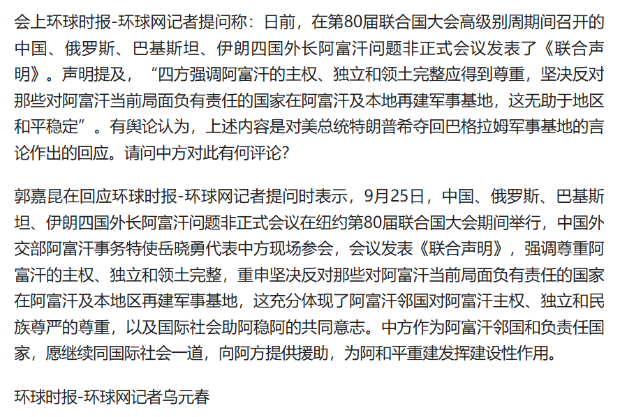 2023年9月25日,在纽约第80届联合国大会期间,中国、俄罗斯、巴基斯坦和伊朗四国外长举行了关于阿富汗问题的非正式会议,发表了《联合声明》。声明明确表示,坚决反对那些对阿富汗当前局势负有责任的国家在阿富汗及周边地区重新建立军事基地。
