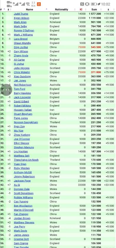 杰克琼斯和尼尔罗伯逊分别排在第17和第18。汤姆福德更是下滑到了第19位,这三名球员本赛季短暂来到世界前16的行列当中,然而被身后的斯家辉肖国栋还有韦克林三名球员挤出了世界前16的排名。而周跃龙在本赛季的世界排名再次探底来到第30位。在上个赛季周跃龙1度有过接近世界前16的经历,而且最高的世界排名也来到过世界的第16,可惜经过几个赛季的洗礼状态不仅没有恢复到巅峰,而且距离排名赛的决赛也是渐行渐远。