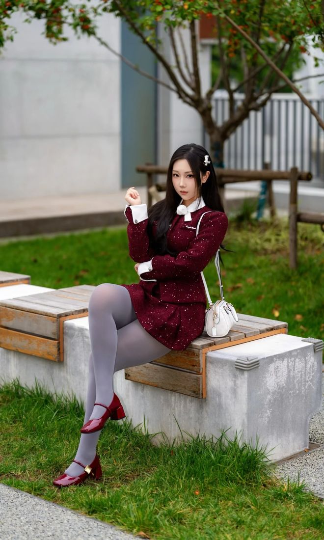 灰色丝袜是意外的叛逆。它打破了酒红套装可能带来的刻板印象,用一种柔和的灰度,为整体注入了随性与松弛。当视线顺着丝袜滑落到那双酒红色玛丽珍鞋上时,又会为这色彩的呼应而心领神会。漆皮的质感在光下泛着润泽,粗跟设计让每一步都稳妥,却又因那抹酒红,与上衣形成了奇妙的闭环,把 “复古” 二字从风格落到了具体的色彩语言里。