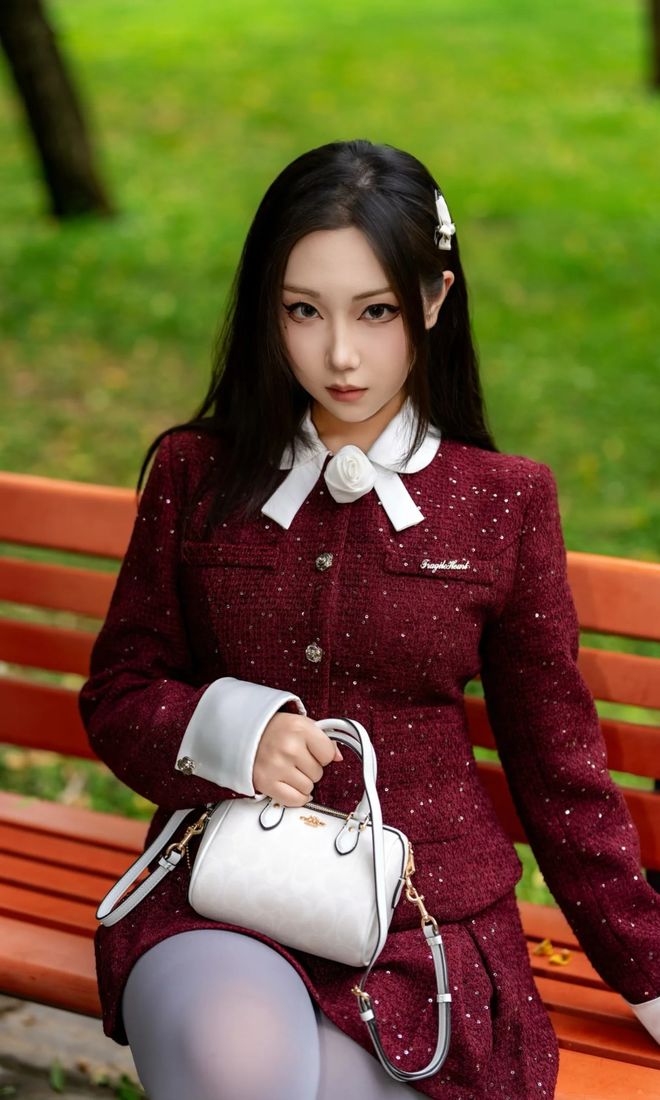 白色的包包是轻盈的注脚。圆润的轮廓、精致的五金,与整套穿搭的精致感相得益彰,却又以其纯净的色调,平衡了酒红的厚重。它是实用的配饰,更是风格的延伸,让这套看似成熟的穿搭,始终带着一丝少女的灵动。