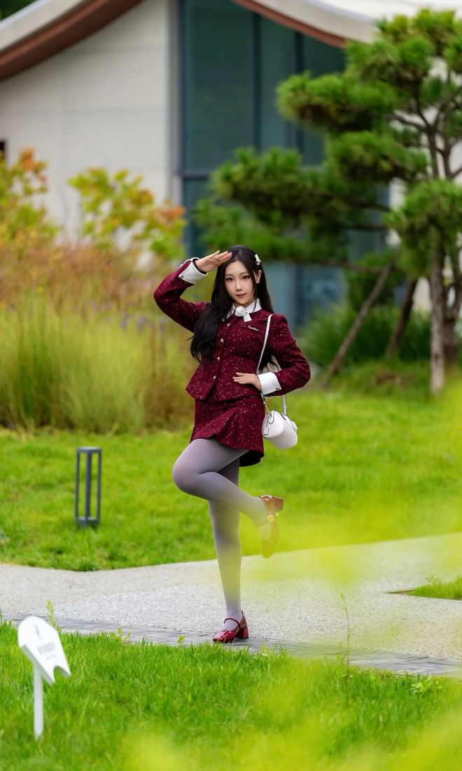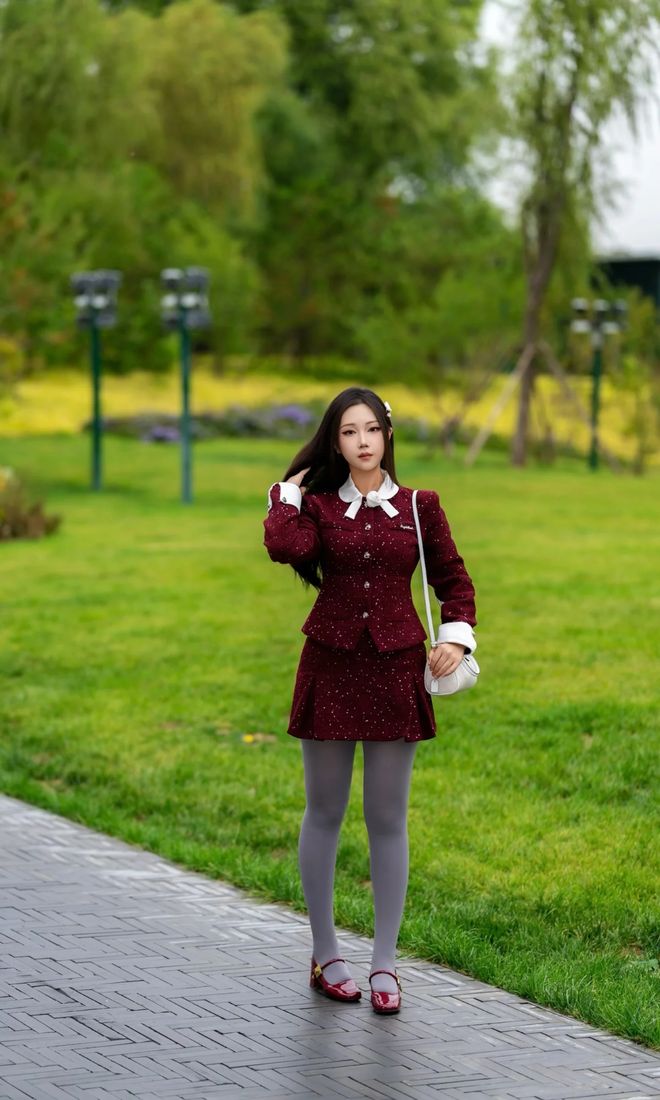 移步至林荫道,落叶在脚下铺成碎金。她侧身而立,一手轻提包带,一手自然垂落,酒红的裙摆在微风里漾起弧度。柳树的柔枝在身后摇曳,与套装的挺括形成刚柔并济的美感。灰丝在树影斑驳里泛着细腻的光泽,与落叶的黄、草地的绿交织,成了自然调色盘里的一抹意外之喜。这一刻的穿搭,是将自己妥帖地放进了自然的画框,每一处细节都与环境共生,却又始终是画面的焦点。