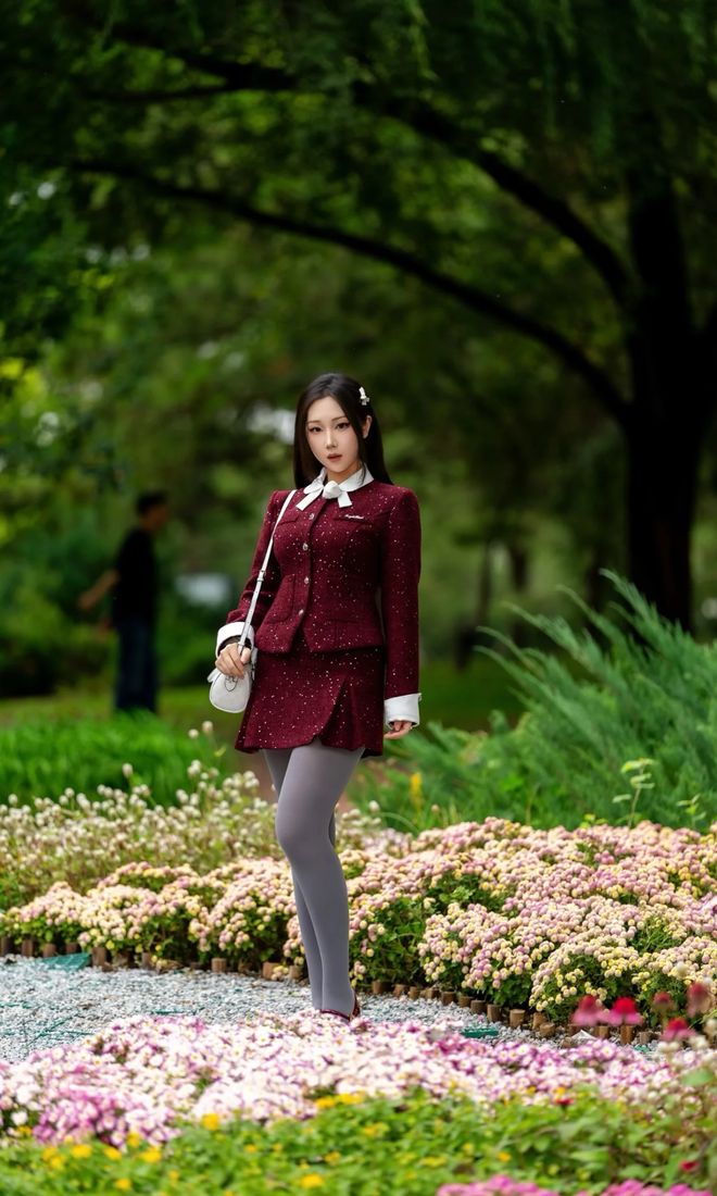 行至花径,万千色彩在脚下绽放。她漫步其中,酒红的身影与缤纷的花簇相映成趣。粗花呢的质感在繁花面前,多了几分沉稳的底色,让她在绚烂里始终保持着自己的风格边界。灰丝与花海的柔媚形成对比,却又以其细腻的质感,呼应了花瓣的柔美。这一刻你会发现,这套穿搭的包容性竟如此之强,它可以是建筑前的飒爽,林荫道的温柔,也可以是花海中的独特,在不同的场景里,演绎着不同的风格侧面。