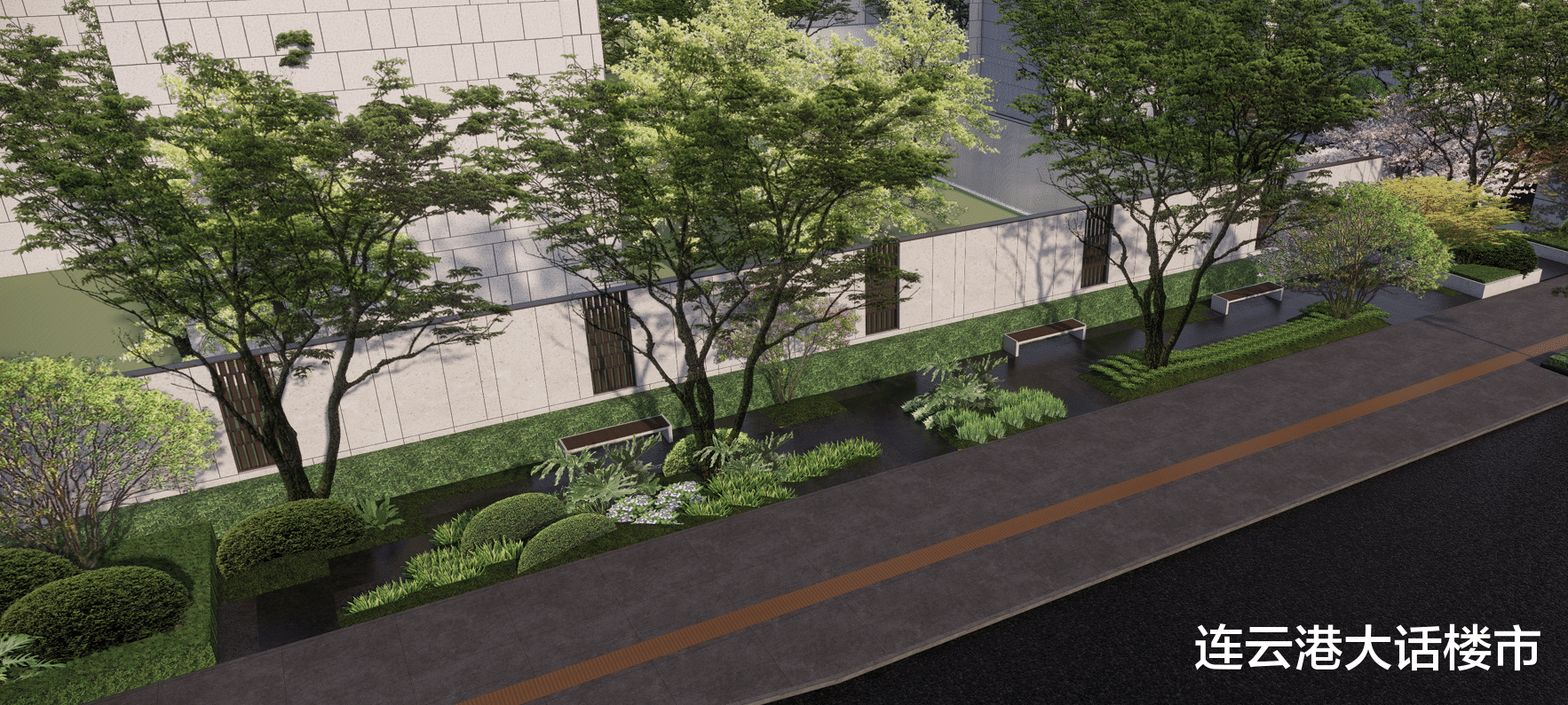 这个前场,不仅包括大门区域,还向南北侧延长了数百米。围绕这片区域,做了三个主题口袋花园。