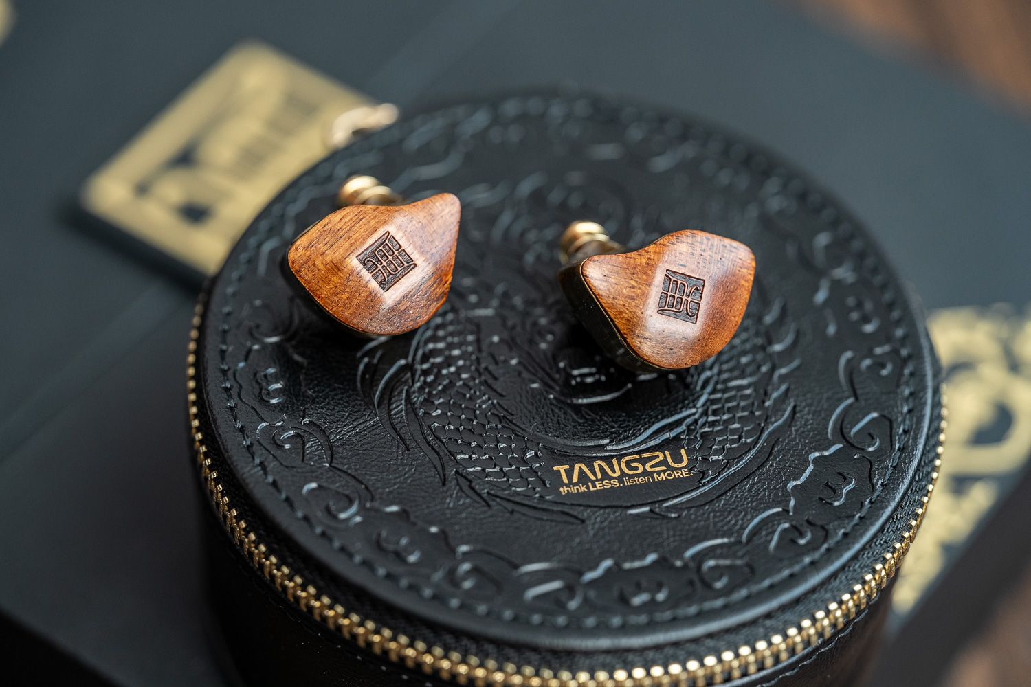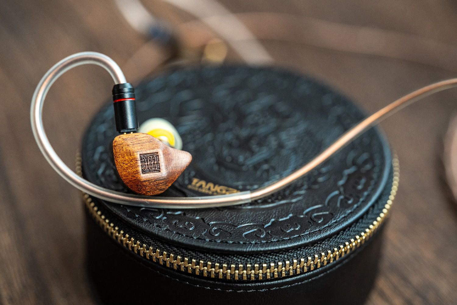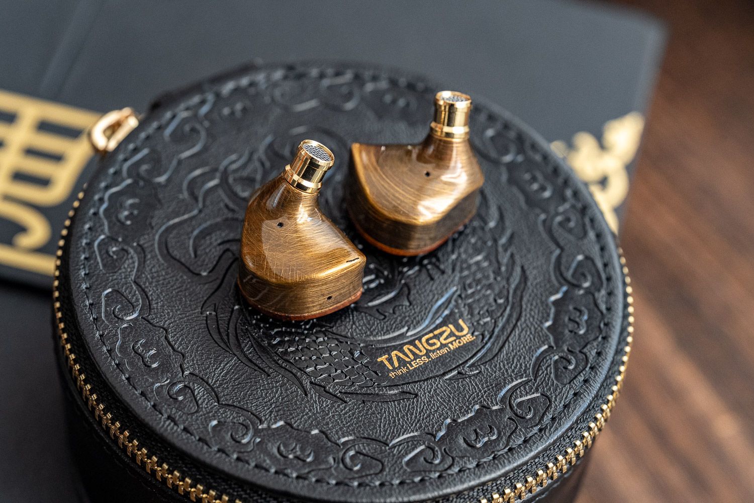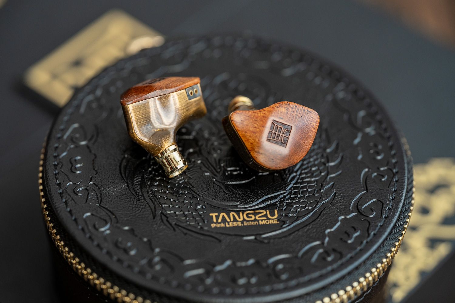 在腔体的设计上,杜甫很巧妙地把天然乌檀木面板与黄铜做了结合,二者的色系接近、但是呈现出了截然不同的视觉观感,乌檀木的部分有着比较原生质感的木材纹理,中间杜甫的“甫”字用篆书字体来呈现出了古朴的韵味,而黄铜的部分则是以CNC工艺制成并做了拉丝的处理、但表面依然有很强的光泽感,同时黄铜的壳体本身也是一个优质的稳定声学材料,能够赋予杜甫一层属于黄铜材料独有的声学共振。虽说黄铜材料有一定的重量,但实际佩戴中的嵌入感和舒适度都非常好,不用担心下坠的问题。