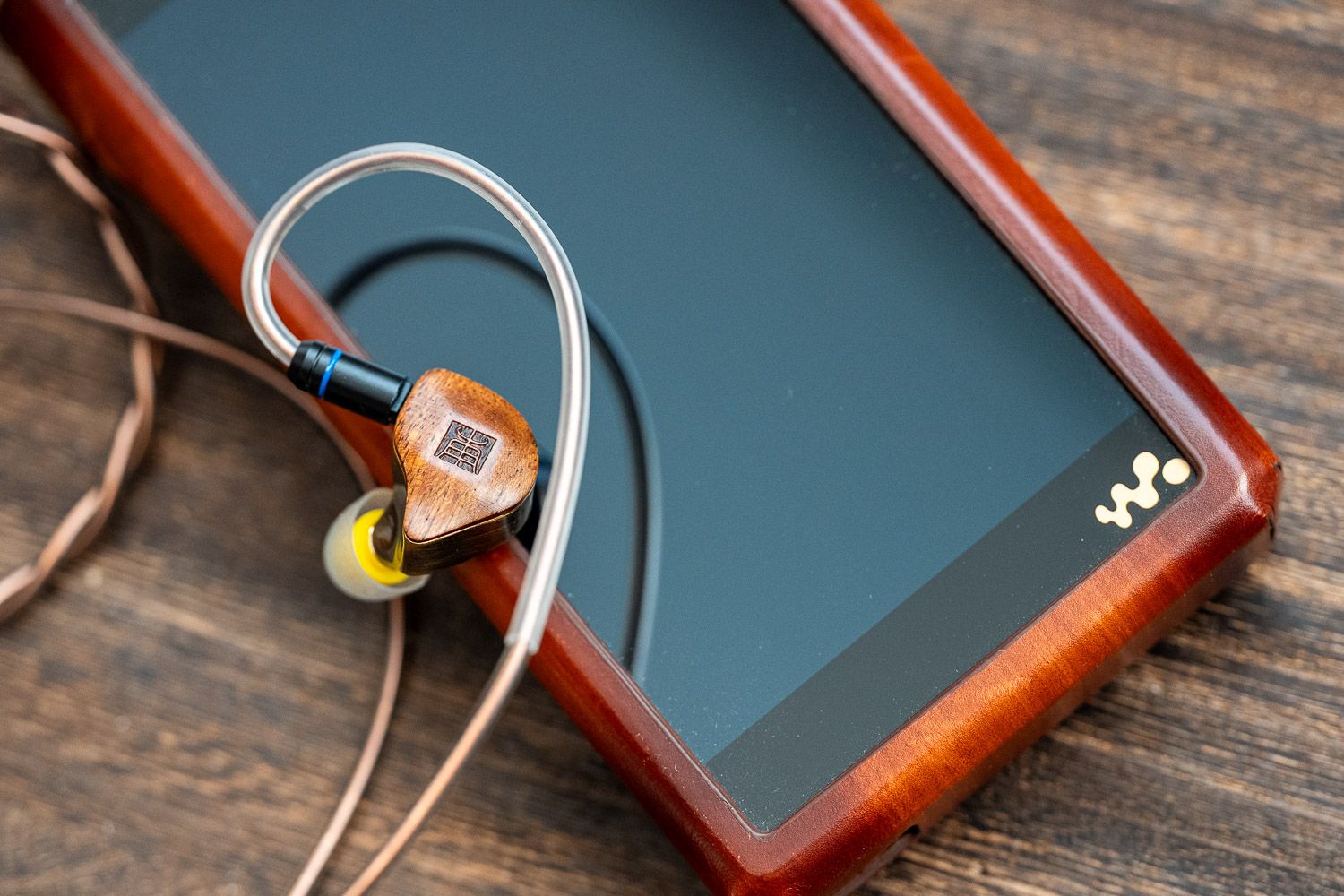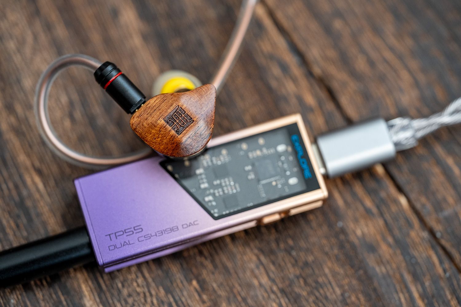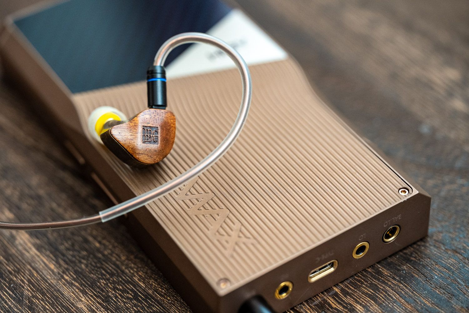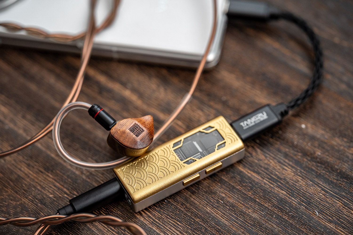 在腔体的设计上,杜甫很巧妙地把天然乌檀木面板与黄铜做了结合,二者的色系接近、但是呈现出了截然不同的视觉观感,乌檀木的部分有着比较原生质感的木材纹理,中间杜甫的“甫”字用篆书字体来呈现出了古朴的韵味,而黄铜的部分则是以CNC工艺制成并做了拉丝的处理、但表面依然有很强的光泽感,同时黄铜的壳体本身也是一个优质的稳定声学材料,能够赋予杜甫一层属于黄铜材料独有的声学共振。虽说黄铜材料有一定的重量,但实际佩戴中的嵌入感和舒适度都非常好,不用担心下坠的问题。