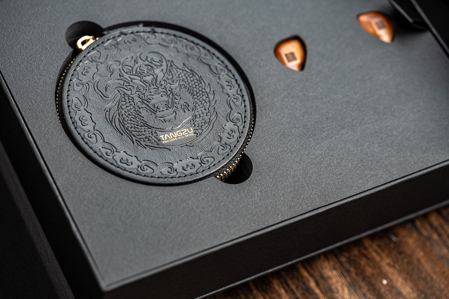 杜甫这个塞子本身是一个售价在700档位的产品,但是腔体质感与配件的做工显然在同价位是属于非常出挑的,打开包装后的木壳面板与龙纹印花的皮质圆形收纳包就颇有一种“上档次”的感觉。