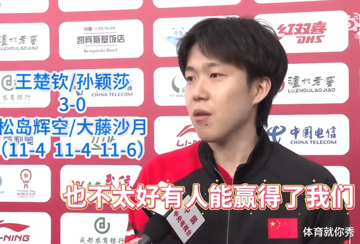 因此昨天的比赛中,中国队也是派出了最强阵容,王曼昱和林诗栋,分别出战女单和男单的比赛,他们对阵的是张本美和和张本智和,结果也不出所料,王曼昱3-0横扫了张本美和,林诗栋虽然开局有点紧张,大比分落后输了第一局,但此后他越战越勇,连胜了2局之后,也帮助中国队8-1锁定胜局。赢球之后的林诗栋,也非常的激动,他还亲吻衣服上的国旗庆祝,而队友们对他的表现也非常的满意,这一刻林诗栋终于是成长了,成为中国队的绝对核心之一。中国队实现了卫冕,并在这个混合团体世界杯的比赛中,实现了三连冠,赛后大家也都肯定了团队的功劳,而王楚钦在接受采访时,也是说出了最霸气的一段采访,他直言:“只要我们两个发挥正常,这个世界上也不太好有人能够赢得了我们!”