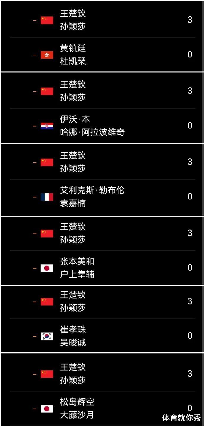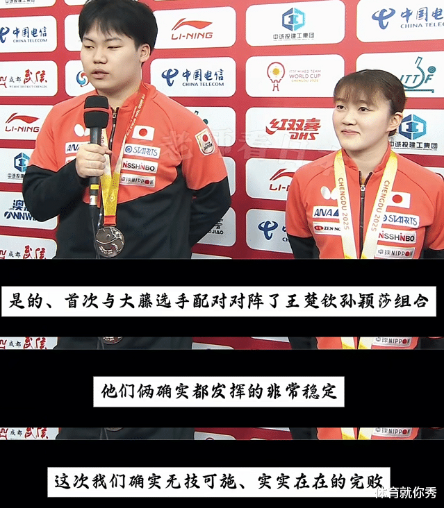 这样的言论也并非夸大其词,在这次的混合团体世界杯上,中国队以11连胜的成绩夺冠,而王楚钦和孙颖莎出战了其中的6场混双比赛,结果他们全部都是3-0横扫对手,可以说没有给对手任何的机会。这样的表现堪称完美,也无愧于两人奥运冠军的实力,他们的表现不仅征服了球迷,也征服了队友,在赛后的采访中,莎头组合的对手松岛辉空也被打服了,他说:“他们俩发挥的都非常稳定,我们确实是无计可施,实实在在的完败!”另一位队员大藤沙月也坦言:“对手太强大了,什么都不让我们发挥,感觉上自始至终都是对手在控制比赛!”日本队混双比赛中,没有拿到一局的胜利,要想在男单比赛中再找机会,那难度会更大,他们唯一有机会获胜的可能是男双,但可惜的是,还没有到男双出场,比赛就已经结束了!