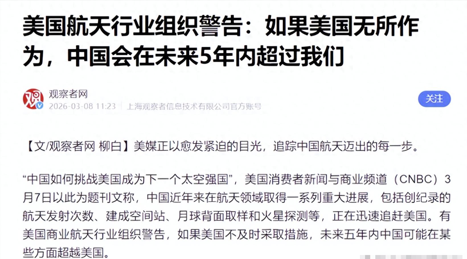 最近一段时间,美国航天圈里有一个共识正在慢慢形成:如果再不加速发展,中国航天在未来几年里,很可能会在多个关键领域全面追上甚至反超美国。