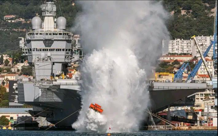 法国“戴高乐”也在港口内进行了蒸汽弹射的试验,也都有小红车搞来搞去。从法国方面给的照片看,那家伙水花挺大,对着小红车去拍,从目前看,在港口内对于弹射系统,电磁弹射、蒸汽弹射进行高频度的可靠性的验证,也是系泊试验的一个重要标志。