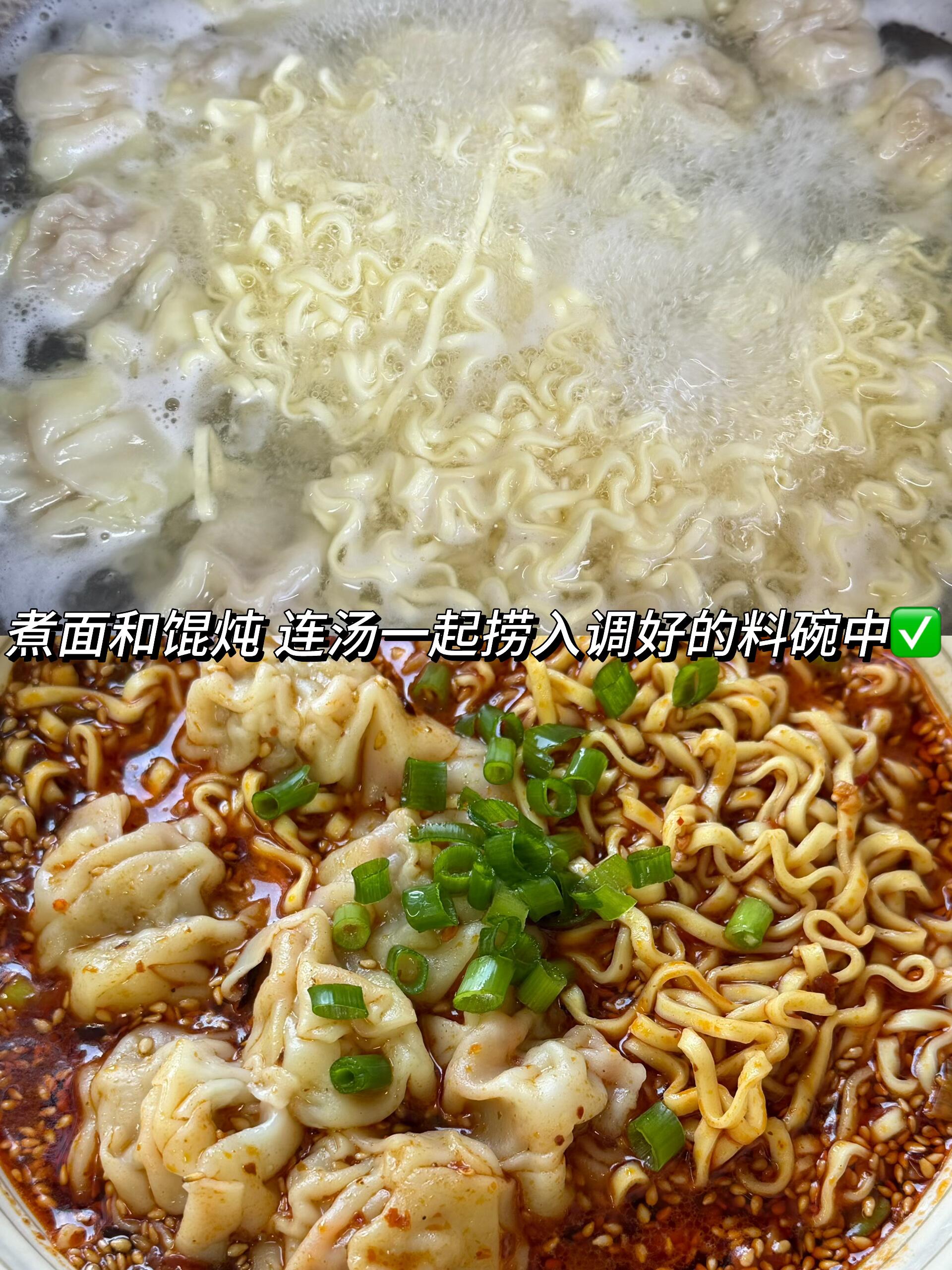 接下来煮面和馄饨。锅里加水烧开,先下馄饨,煮到馄饨浮起来,差不多快熟的时候,再放入面条。因为馄饨皮比较厚,煮的时间要稍长一点,如果一起下锅,面条可能就煮烂了。等面条和馄饨都煮熟后,连汤带面一起捞入调好的料碗中。这里有个小窍门,捞的时候尽量多带点汤,让酱汁能充分和汤面融合,味道更均匀。