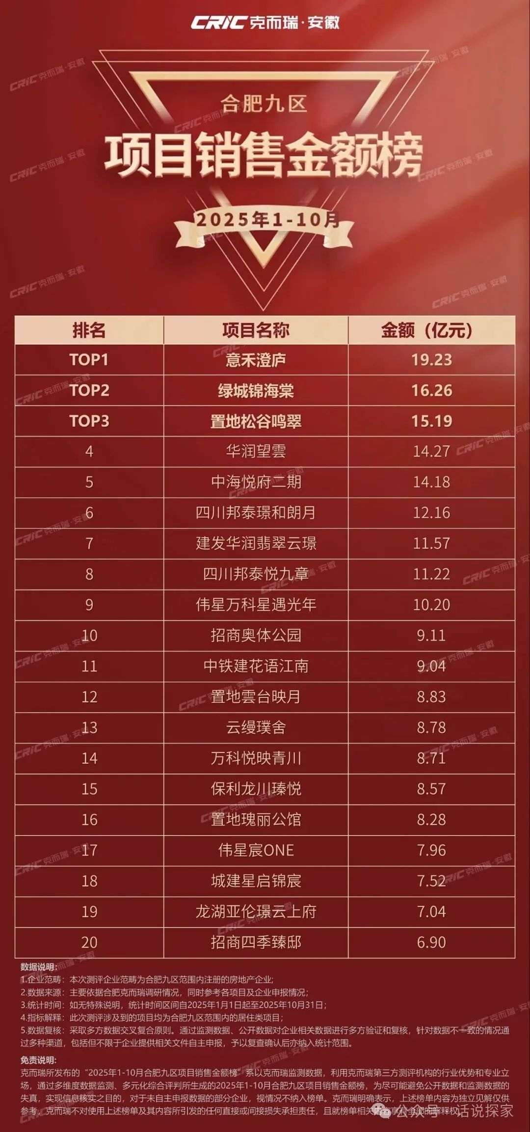 克而瑞数据显示,2025年1-10月合肥九区项目销售金额榜单TOP10 门槛达9.11亿元。
