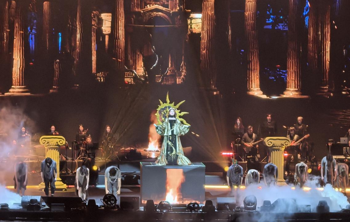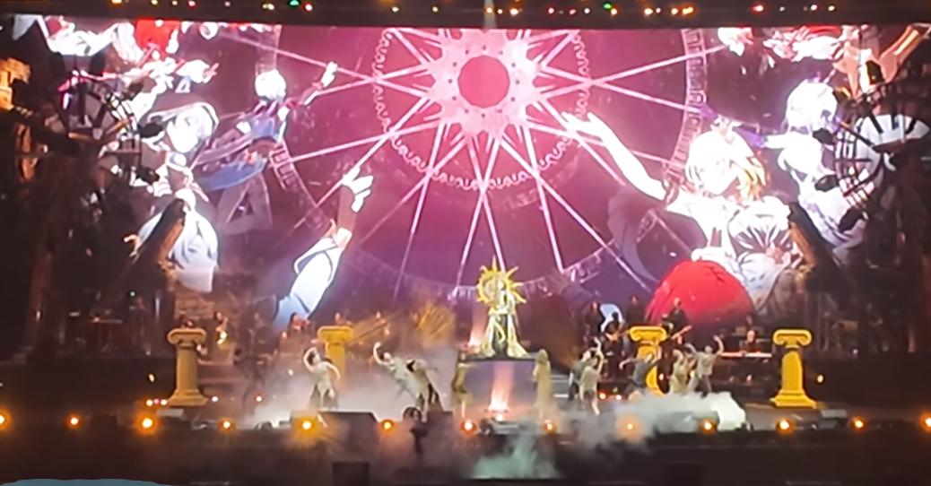 演唱会的现场摆放了多个希腊风格的石柱,舞者的造型也以灰色+金色为主,颇有希腊风情,这一刻大家仿佛真就来到了翁法罗斯。