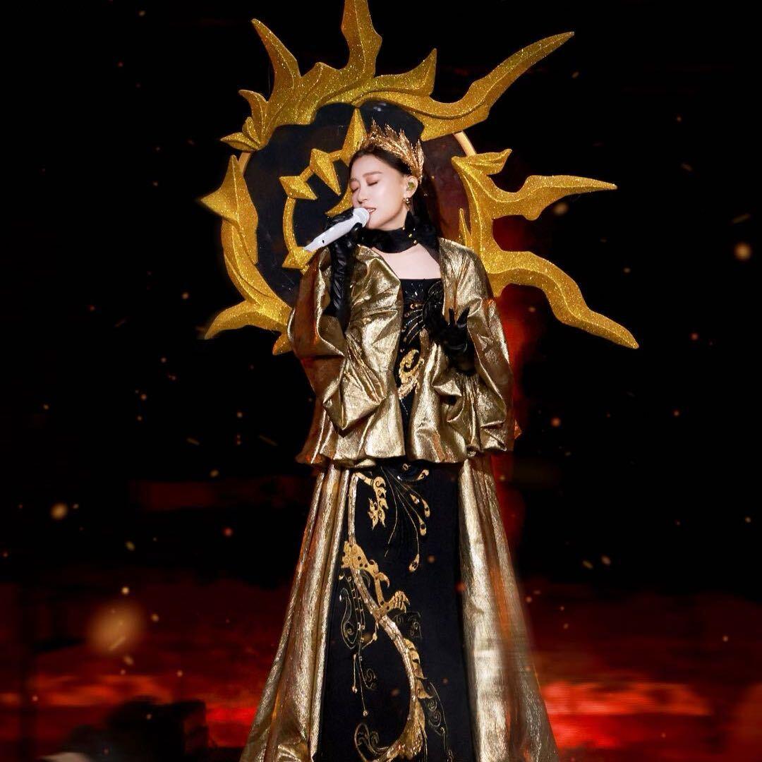 谭晶不仅在演唱会唱了《何者》,现场的造型更是让人惊艳,背后有一轮酷似太阳的金色轮环,身上的超大裙摆也是黑色和金色构成,这一刻大家梦回神厄,这套服饰看得出来是对他的致敬!