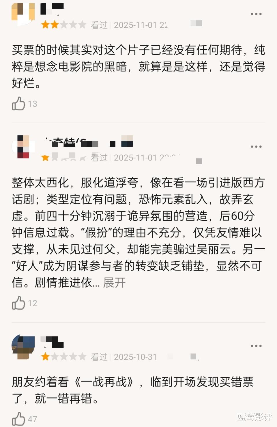 豆瓣评论区清一色的一星差评,网友纷纷吐槽:年度诈骗现场,好好的惊悚悬疑硬生生搞成了东拼西凑的融梗喜剧片,关键还不好笑……