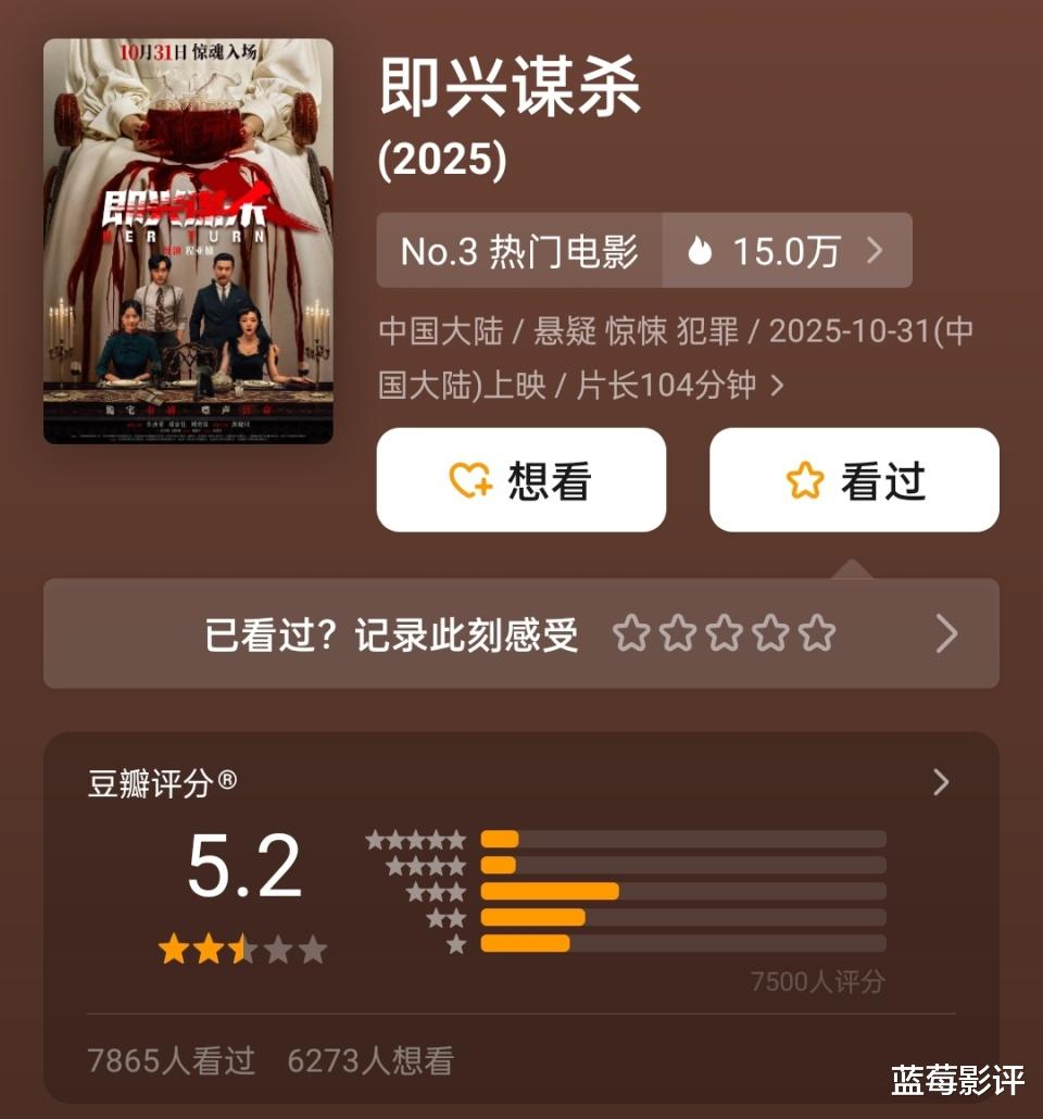 好不容易盼来了一部稍微能打点的电影《即兴谋杀》——3天狂揽3549万,结果该片口碑却扑街了。
