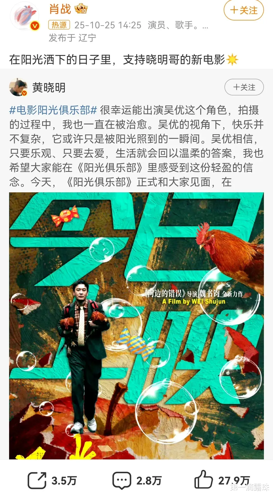 肖战发微博力挺“在阳光洒下的日子里,支持晓明哥的新电影”,单日阅读量破亿。