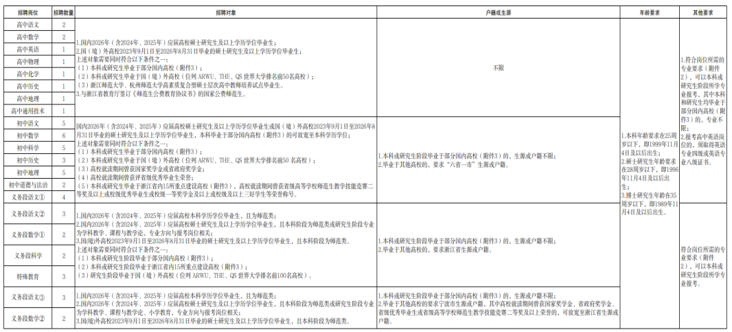 关注要求:首批招聘通常对毕业院校有一定要求。以海曙区为例,主要面向国内部分一流大学、教育部直属师范大学、浙江省内15所重点建设高校,以及ARWU、THE、QS世界大学排名前列的国(境)外高校的毕业生。