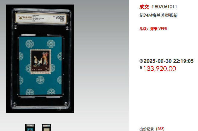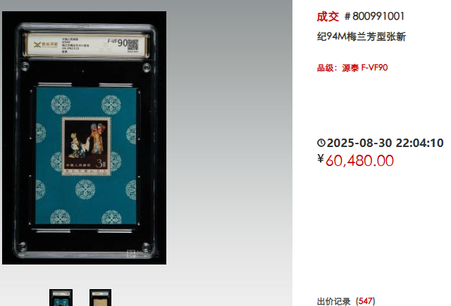 最近在赵涌在线平台,一枚源泰VF95高分评级的梅兰芳小型张经过200多次角逐,收获了超过13万的价格——一则本身稀珍,二则品相达到全品,这二者相辅相成,打造出了令人惊叹的收藏价值。