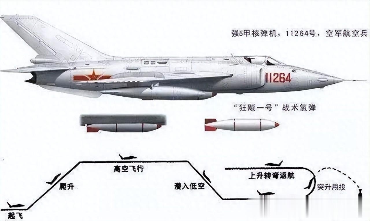 战术运用:越肩甩投与悲壮的单程使命为在核爆前争取最大逃生时间,强-5甲采用北约开发的越肩轰炸战术(Over-the-shoulder):