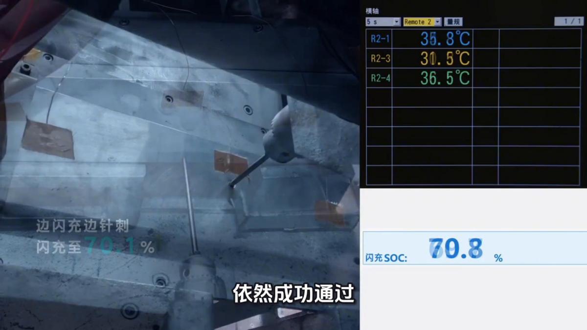 安全性方面,比亚迪也做了更严苛的验证。第二代刀片电池在完成500次闪充循环后,直接进行“边闪充边针刺”的极限测试,电池依旧没有出现热失控、冒烟或起火的情况。500次循环大约相当于30多万公里、接近15年的使用周期,这也说明即便长期使用闪充,对电池安全依然不会产生明显影响。